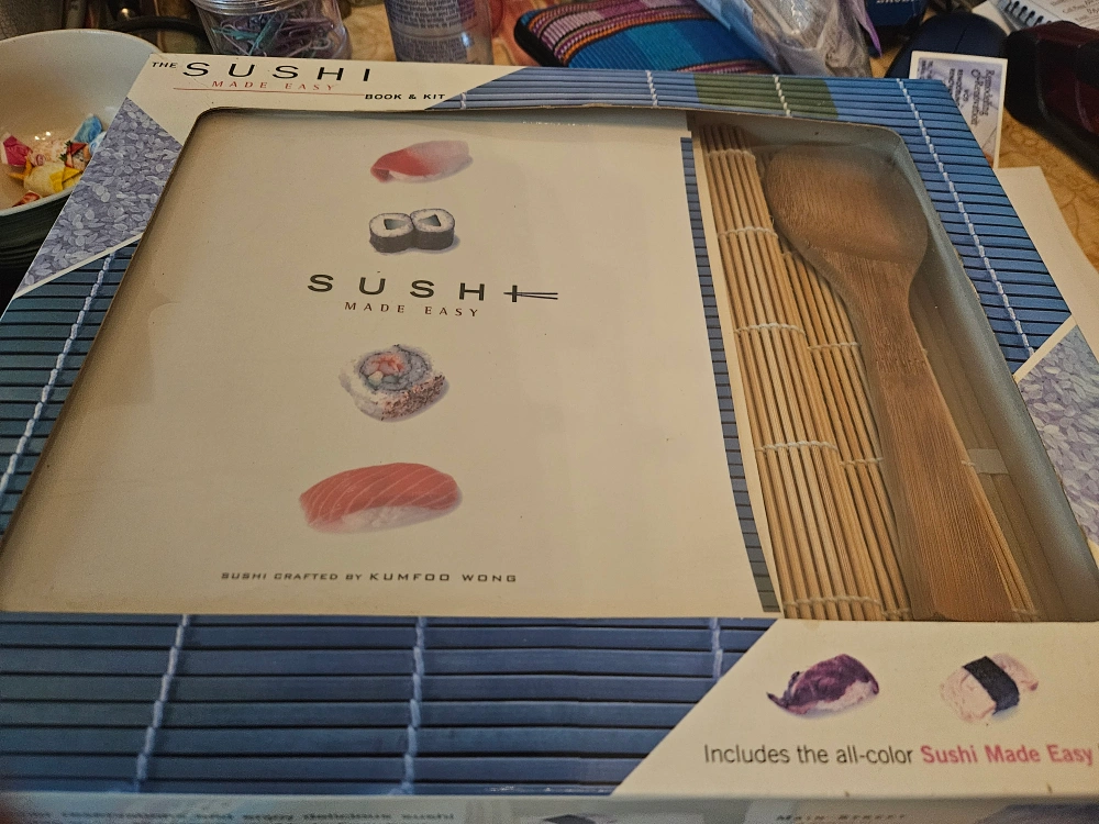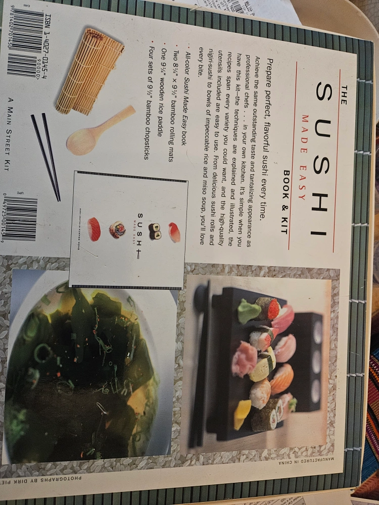 Selling 'The Sushi Made Easy' book and kit! It comes with everything you need to prepare perfect, flavorful sushi every time. The kit includes the all-color Sushi Made Easy book, two 9" x 9" bamboo rolling mats, one 9" wooden rice paddle, and four sets of 9 1/2" bamboo chopsticks