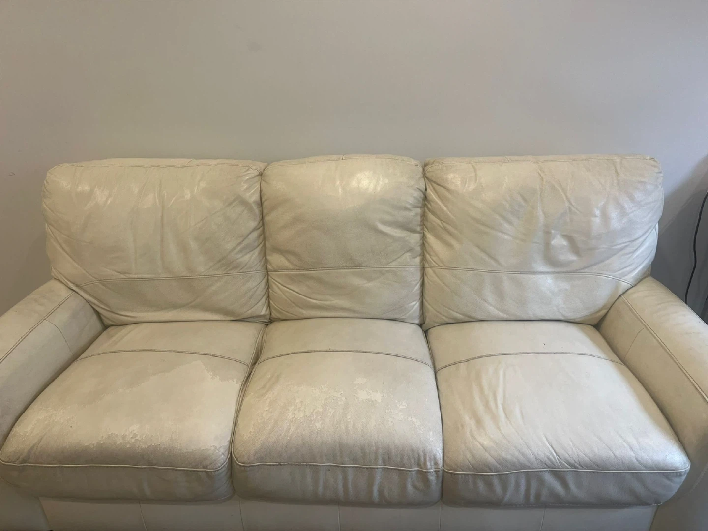 Selling a used cream-coloured leather sofa. It's a three-seater and has some signs of wear, as you can see in the photos. Still comfy and has lots of life left! Pick up only