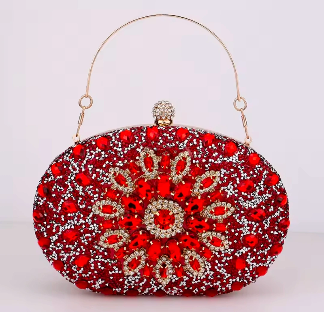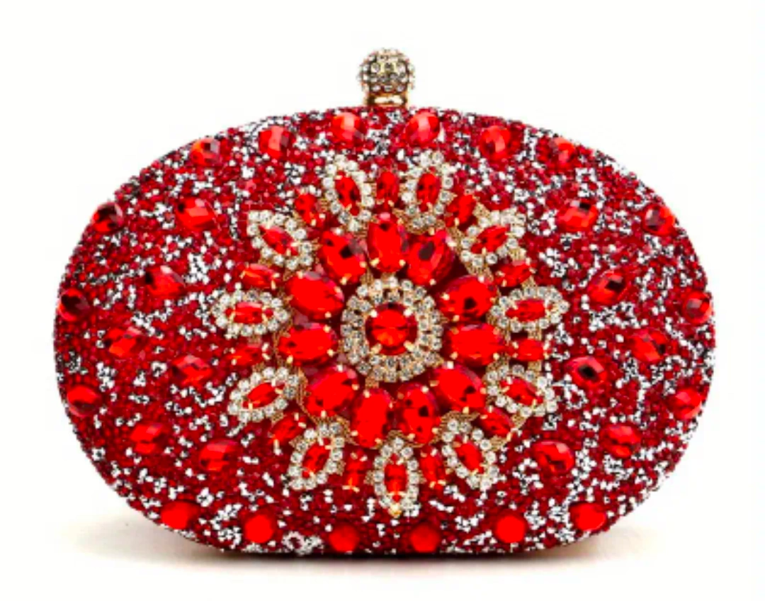 This is a beautiful red crystal evening clutch bag. It's in great condition and comes with a chain strap and handle. Perfect for a night out!