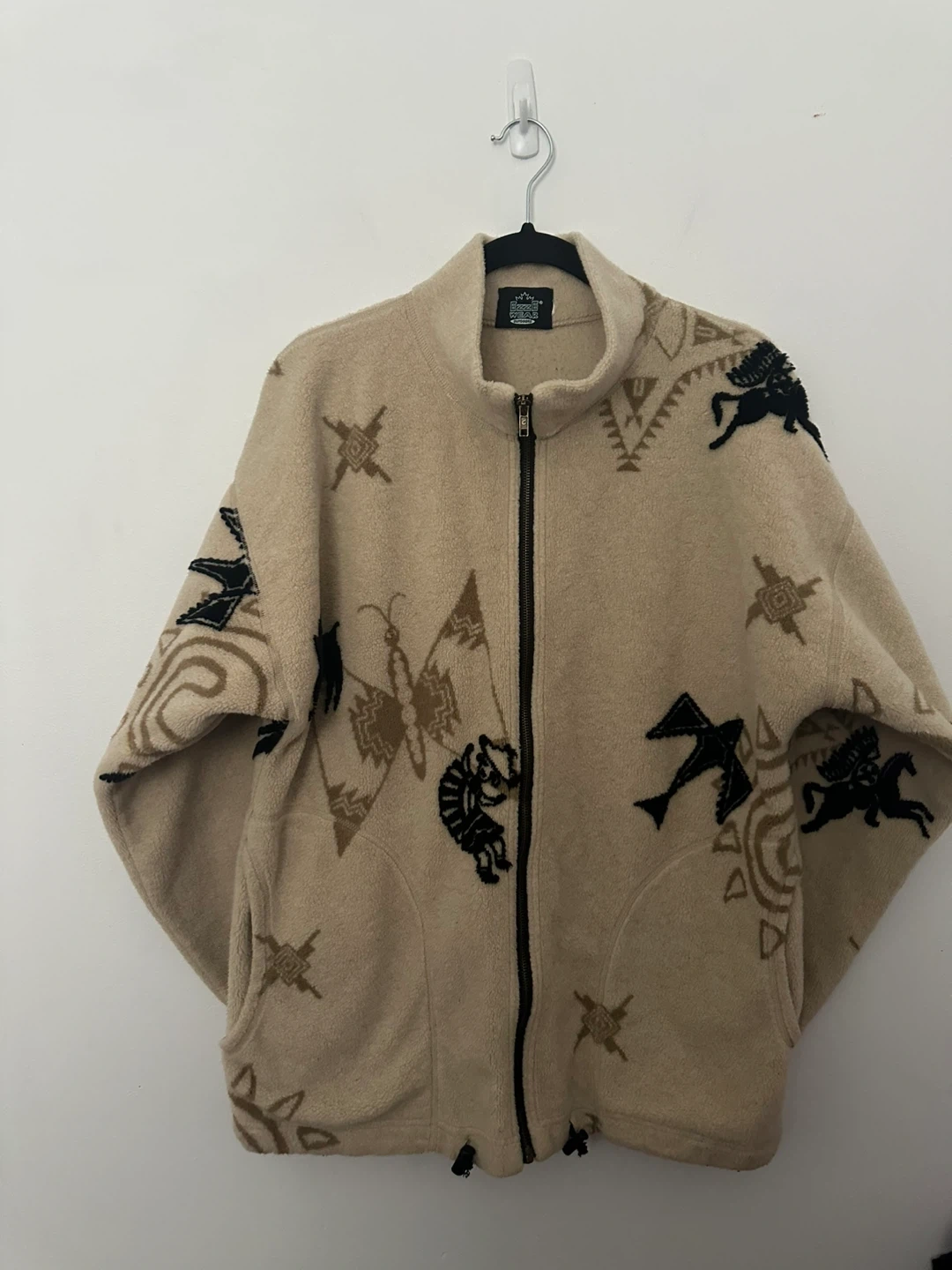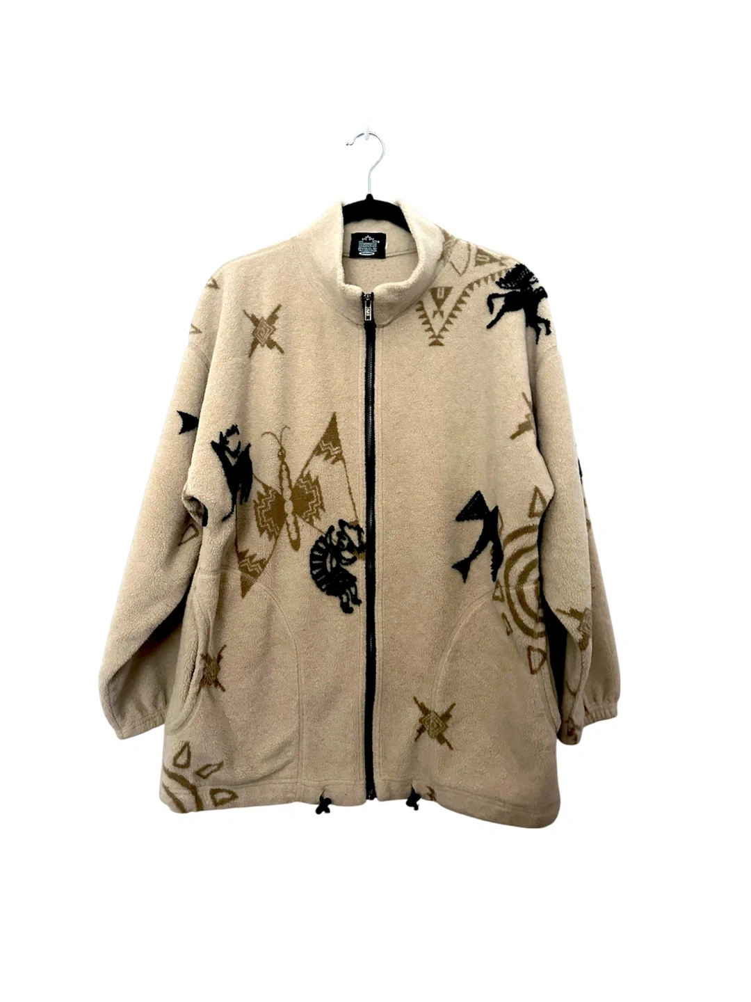 Cozy fleece jacket featuring a unique indigenous -inspired design. Perfect for adding a touch of cultural flair to your wardrobe! It has a full zip and is in great condition.