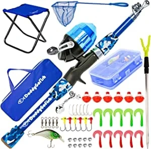 DaddyGoFish Kids Fishing Pole – Telescopic Rod & Reel Combo with Collapsible Chair, Rod Holder, Tackle Box, Bait Net and Carry Bag for Boys and Girls