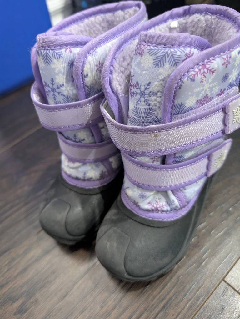 - A pair of purple and white snow boots with snowflake design