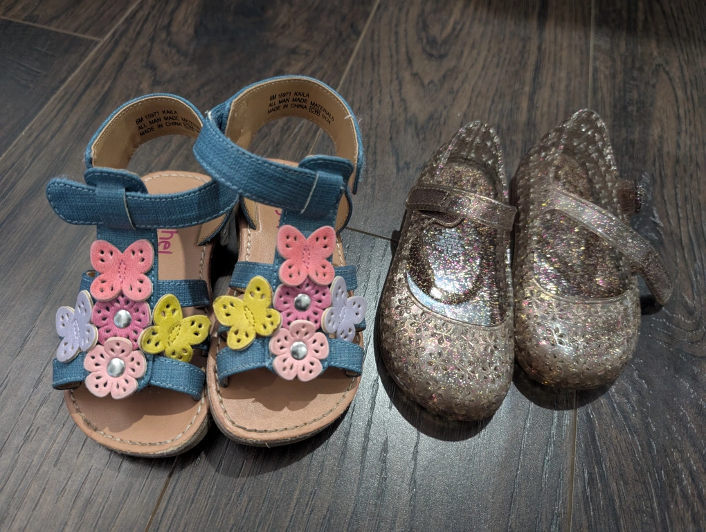 - A pair of blue sandals with butterfly and flower embellishments