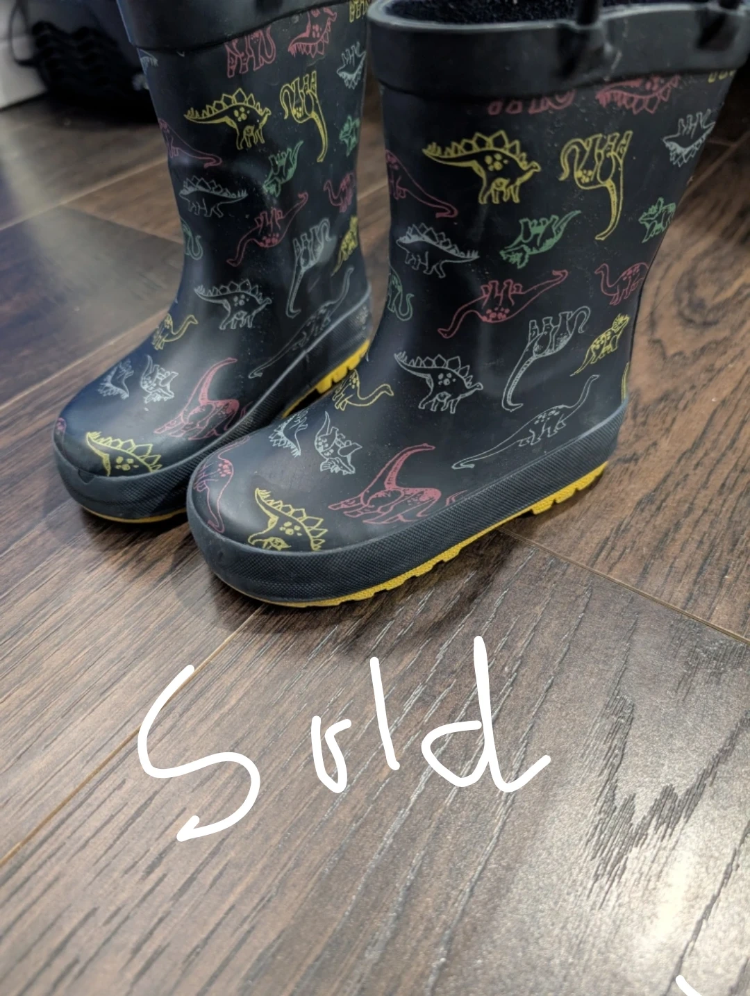 - A pair of black rain boots with dinosaur prints