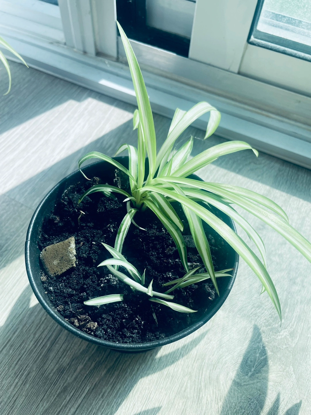 I'm selling a healthy spider plant potted in a black container. It's perfect for adding a touch of greenery to your home or office!