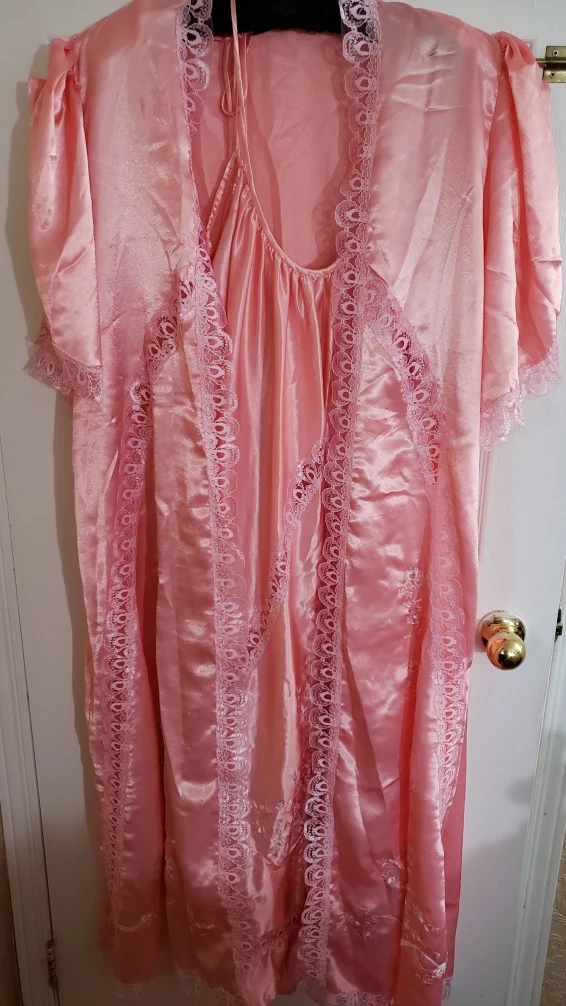 Selling a pretty pink satin lingerie set . It features delicate lace trim and a lovely floral design. Perfect for adding a touch of elegance to your sleepwear collection!