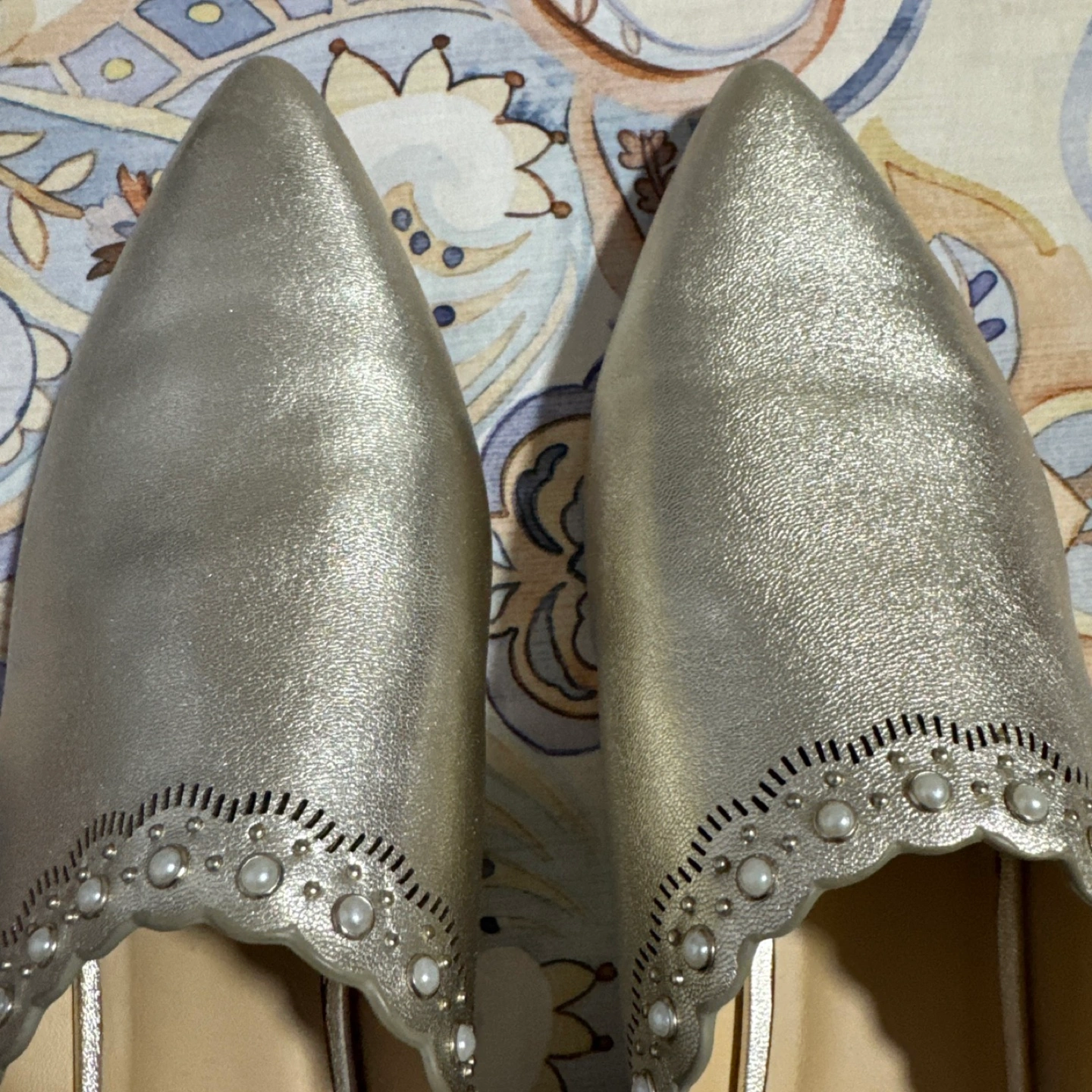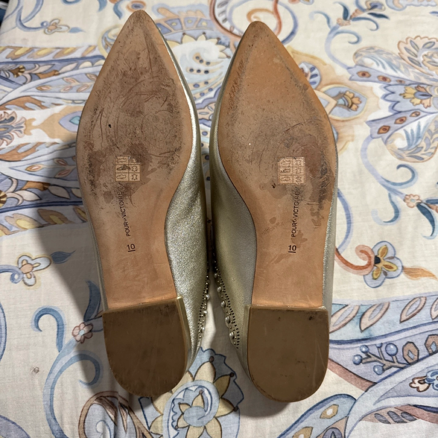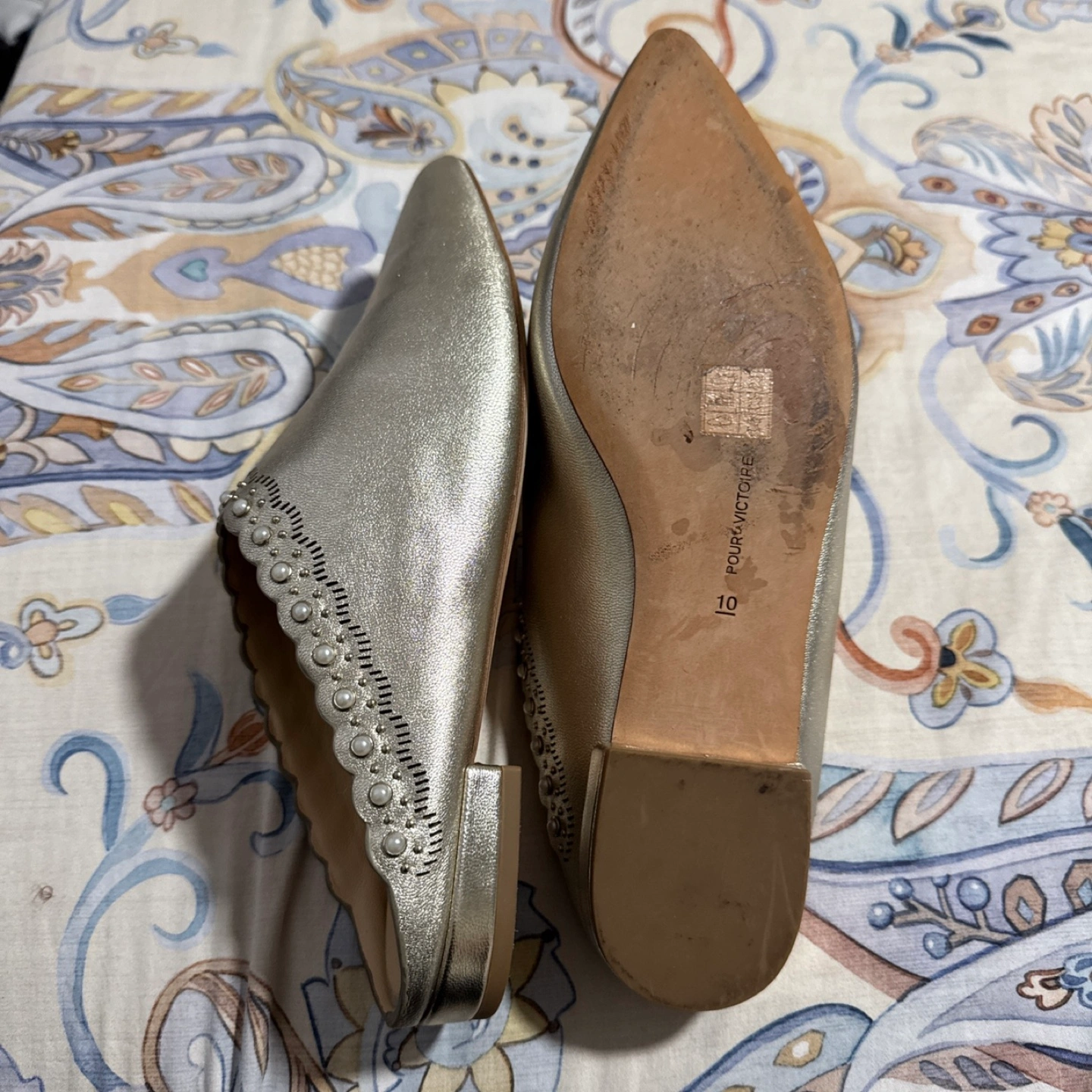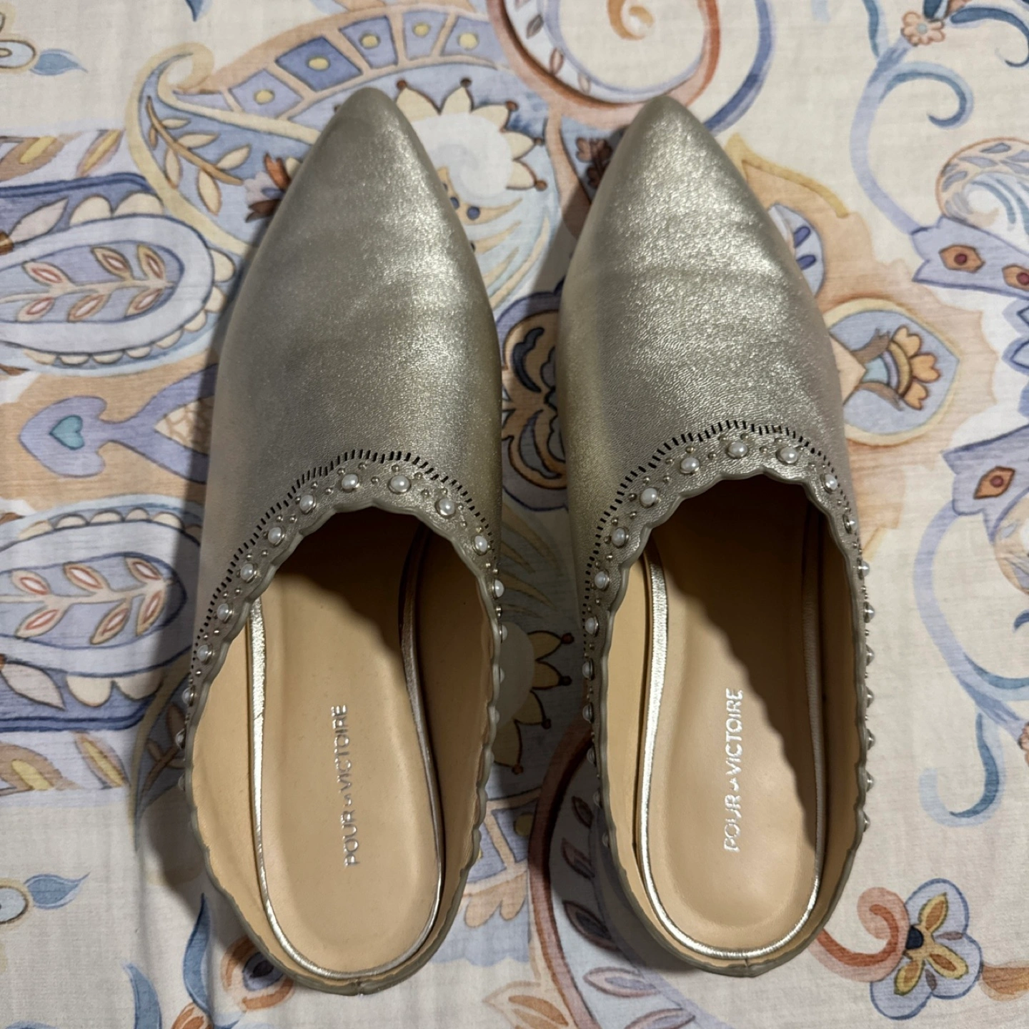 These are a pair of Pour La Victoire mules in a shiny gold color! They are a size 10 and have a cute pearl trim. Worn 1-2 times- uppers are in great shape! Leather upper and sole! Very beautiful and comfortable.