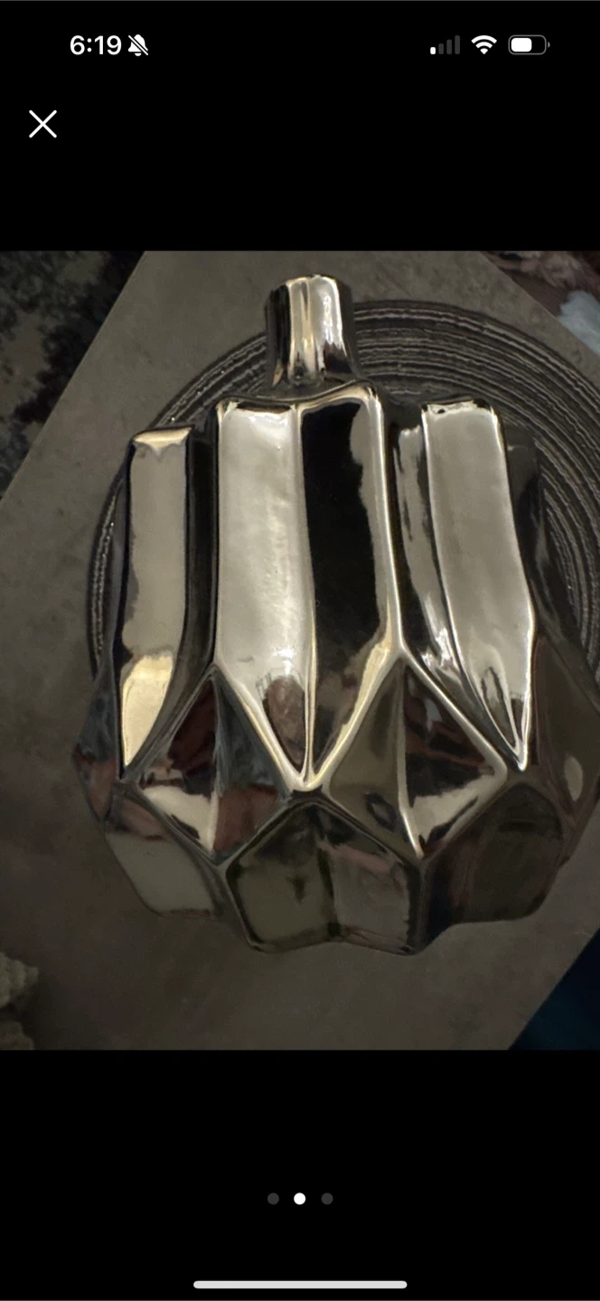 345I'm selling a silver decorative vase and a small end table. They're both in great shape and would look lovely in any home. The vase has a unique geometric design, and the end table has a stylish top. They're both sturdy and ready to be used!