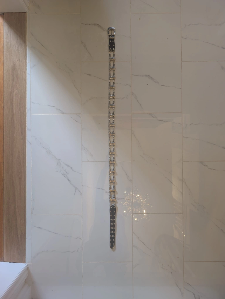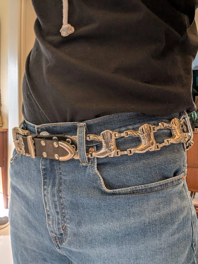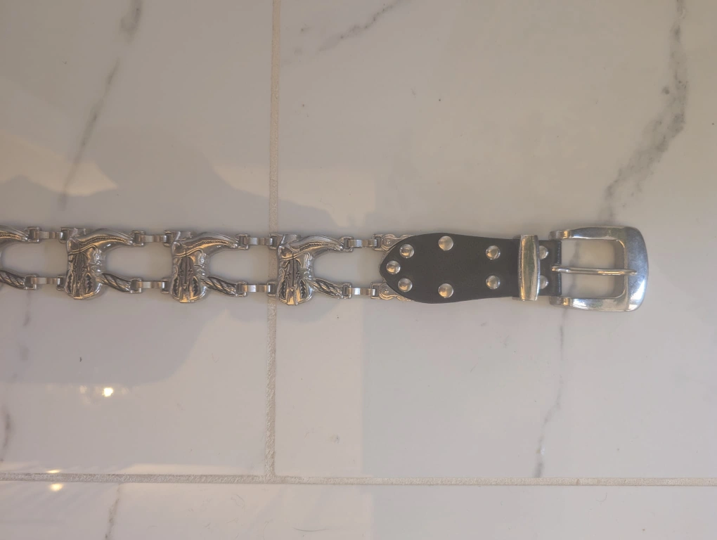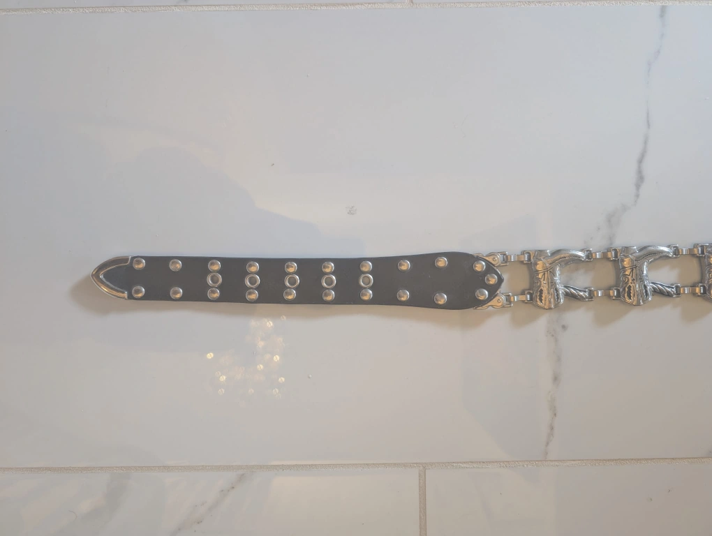 Selling a unique belt with a silver-toned design and black leather backing! The belt is marked as 'Genuine Leather Italian Style' and XL size 42-44. It's a statement piece that's sure to add some flair to any outfit