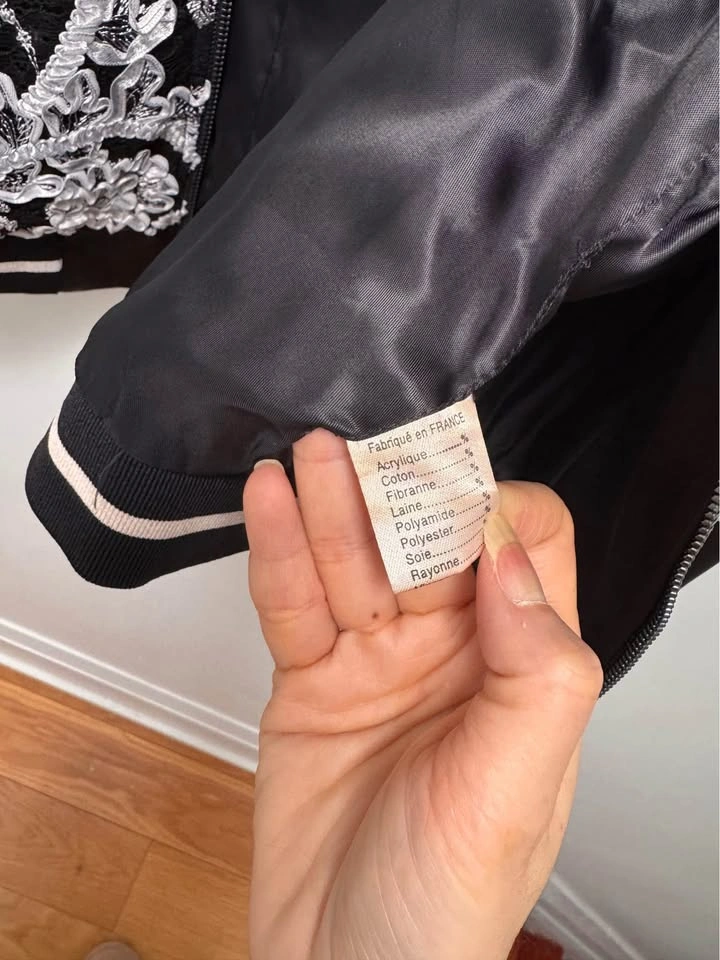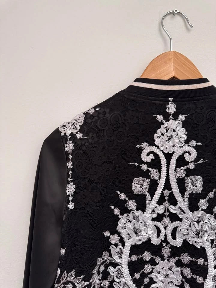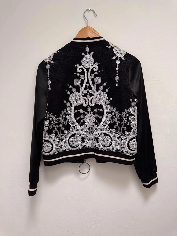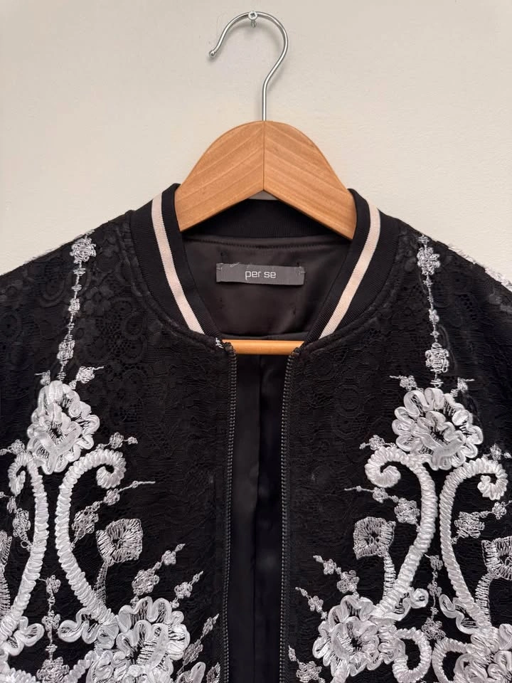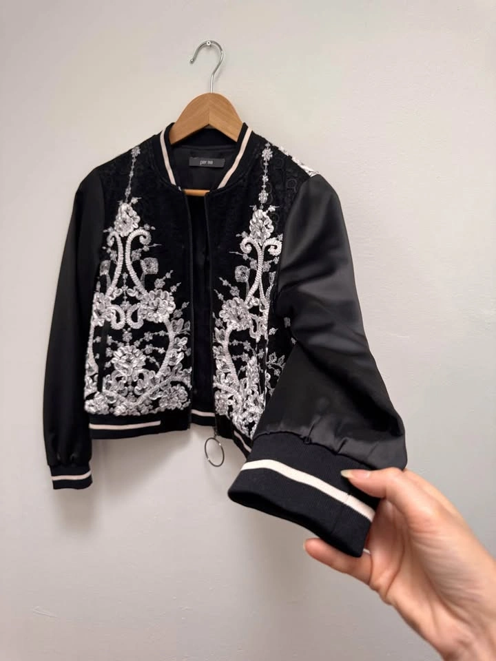 Floral appliqué adorned black Bomber Jacket Size S by Per Se Fits Size S or XS in my opinion Porch pickup Christie St and St. Clair West Ave (Toronto)