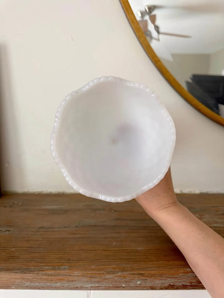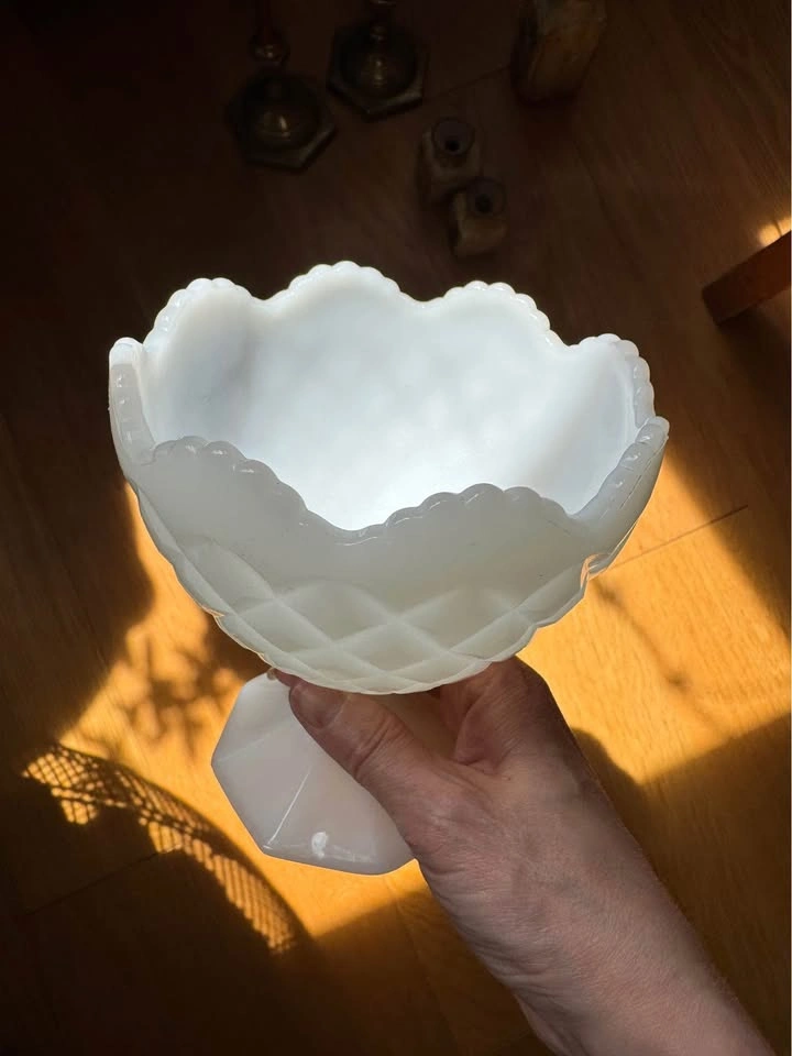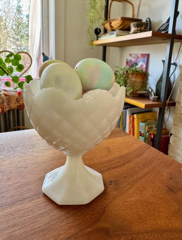NAPCO WHITE MILK GLASS VASE, CANDY DISH OR COMPOTE 1184 IN VERY GOOD CONDITION ~ NO CHIPS, CRACKS OR STAINS Made by Napco, Cleveland, Ohio. Can be a candy dish or used as a vase or as a decorative accent. I filled it with Easter Eggs for Easter. 5.5" H 5" W Porch pick up Christie St and St. Clair West Ave. If ad is up, it’s available. Vintage / unique / antique/ collectible modern
