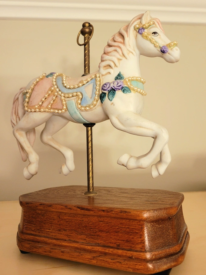 A charming carousel horse music box! It features a white horse with decorative details, mounted on a wooden base. Perfect for adding a touch of whimsy to any room. The music box no longer works, but the horse and stand are in good condition.