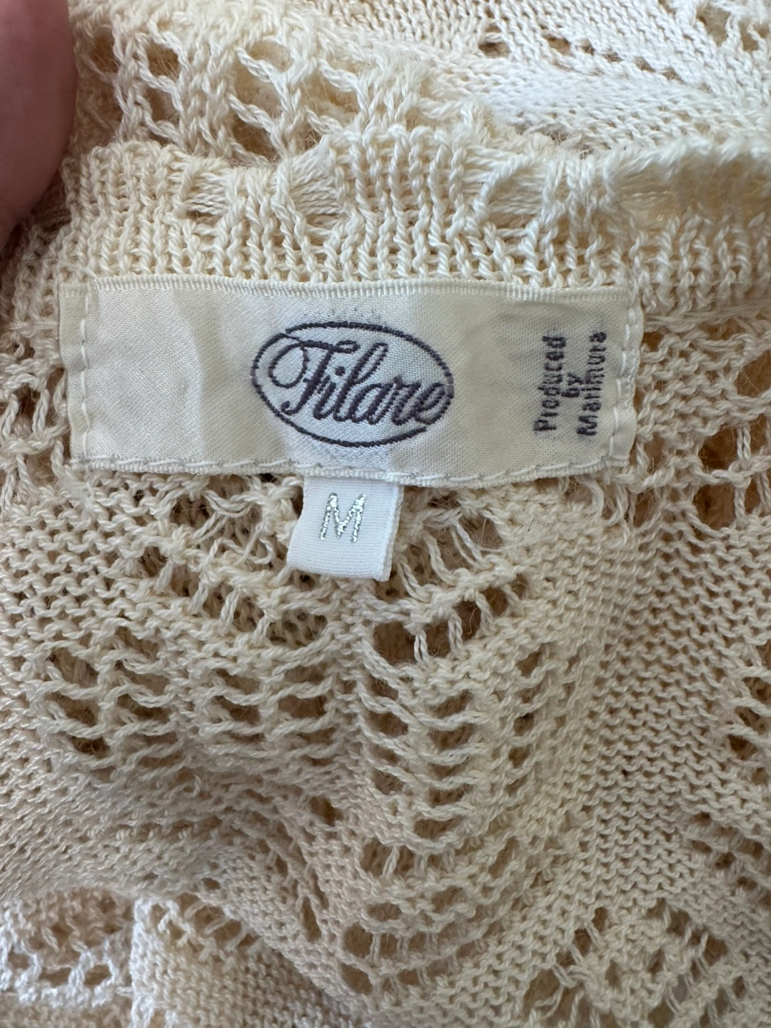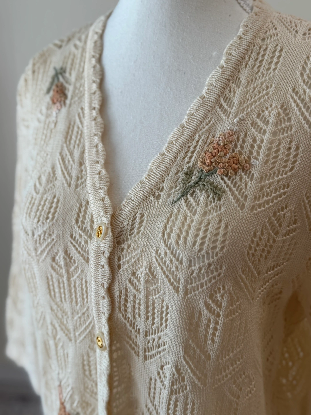A charming vintage crochet knit cardigan crafted from a breathable cotton-linen blend. Featuring delicate openwork knit patterns, floral embroidery details, and gold-tone decorative buttons, this piece offers a feminine yet effortless boho vibe. Perfect for layering in spring and summer or as a romantic touch for casual and festival outfits.