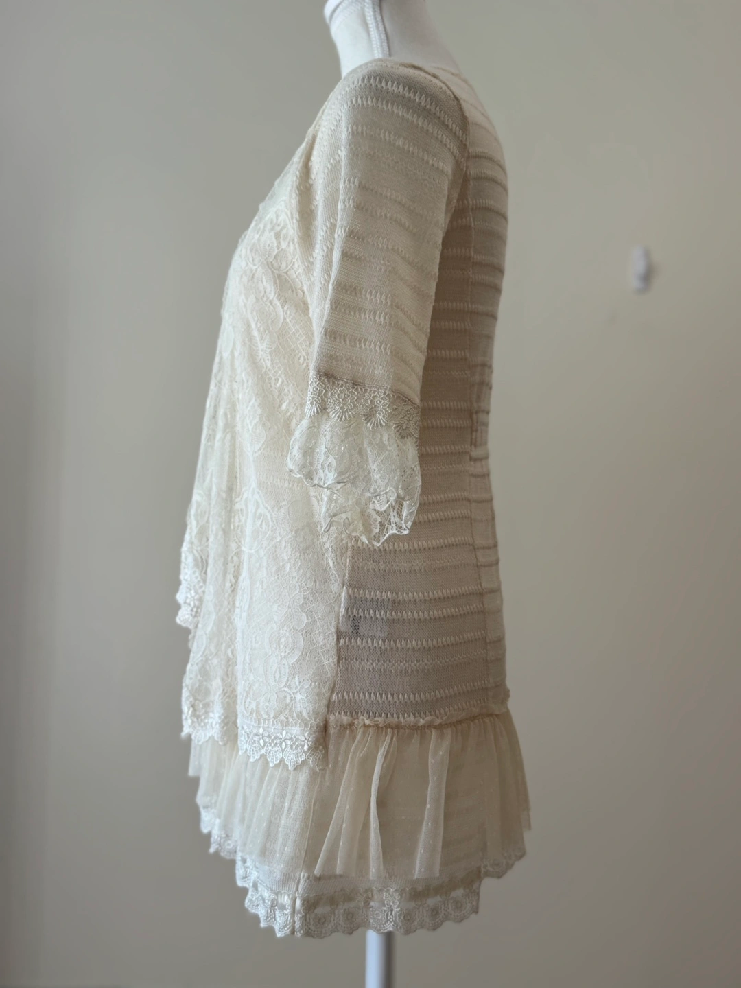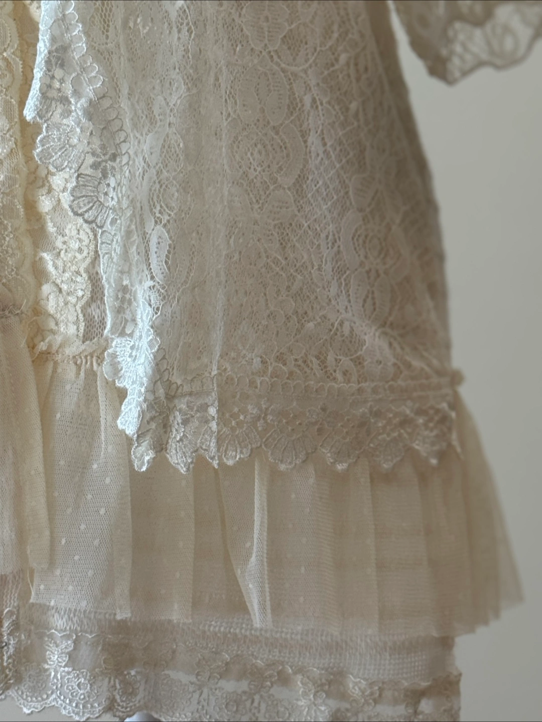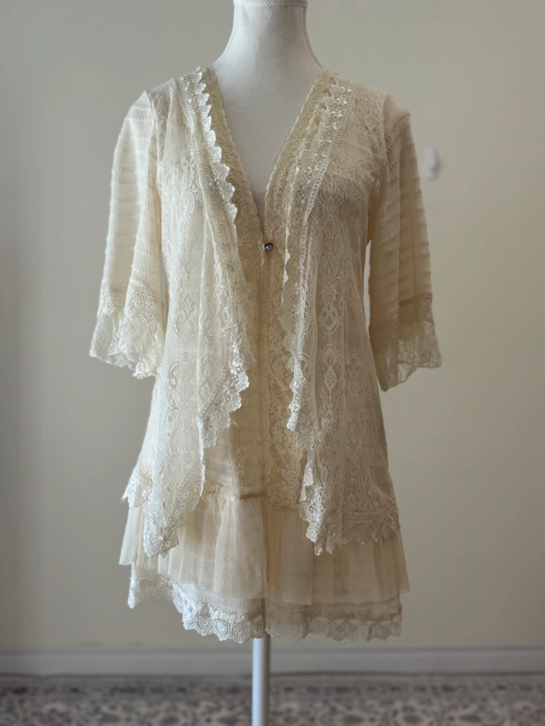 A dreamy axes femme vintage-inspired lace cardigan featuring a romantic layered design with sheer lace panels and delicate scalloped trim. This longline cardigan doubles as a robe or lightweight layering duster, perfect for fairycore, mori girl, bohemian, or romantic vintage-inspired wardrobes.
