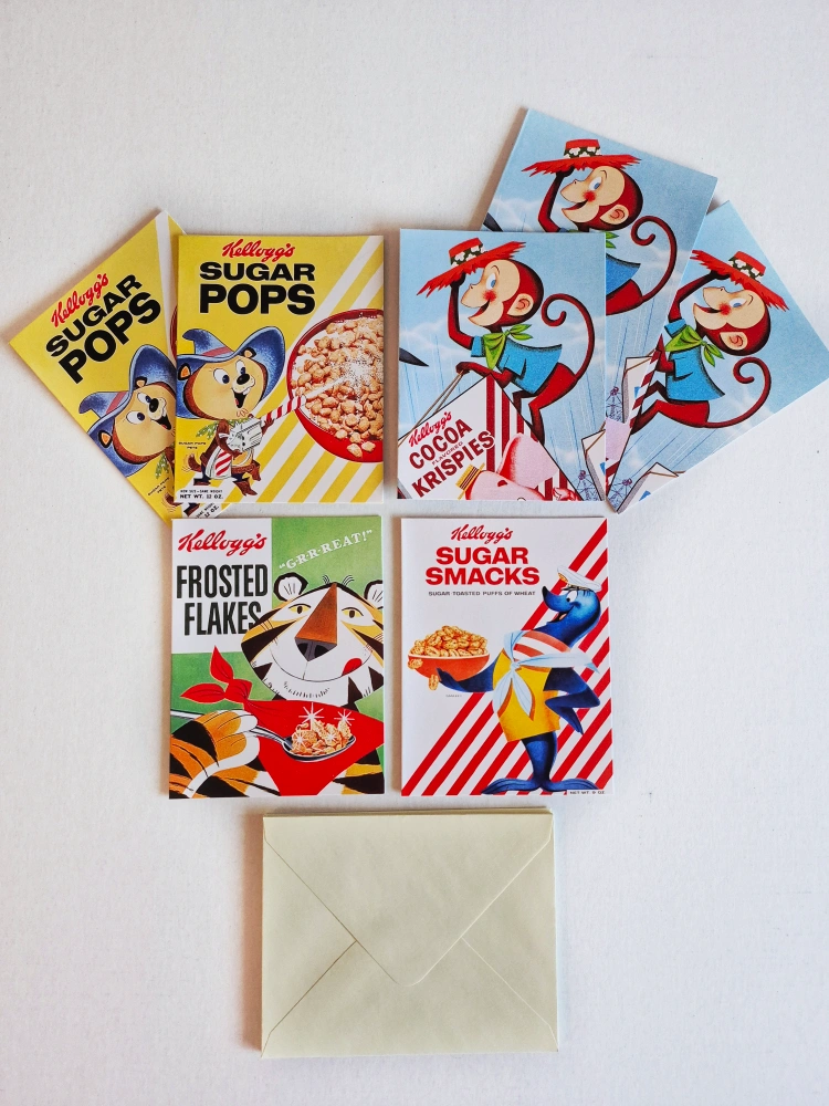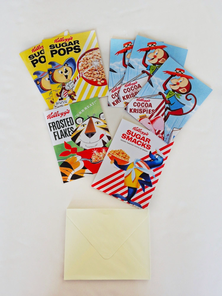 1000+New cards featuring images of vintage cereal boxes: • Sugar Pops x 2, • Frosted Flakes x 1, • Cocoa Crispies x 3, and • Sugar Smacks x 1. 7 cards in all. Brand new. Blank inside. Size: 5.5" x 4" (just over) With envelopes 👉 Pick up from Yonge & St Clair