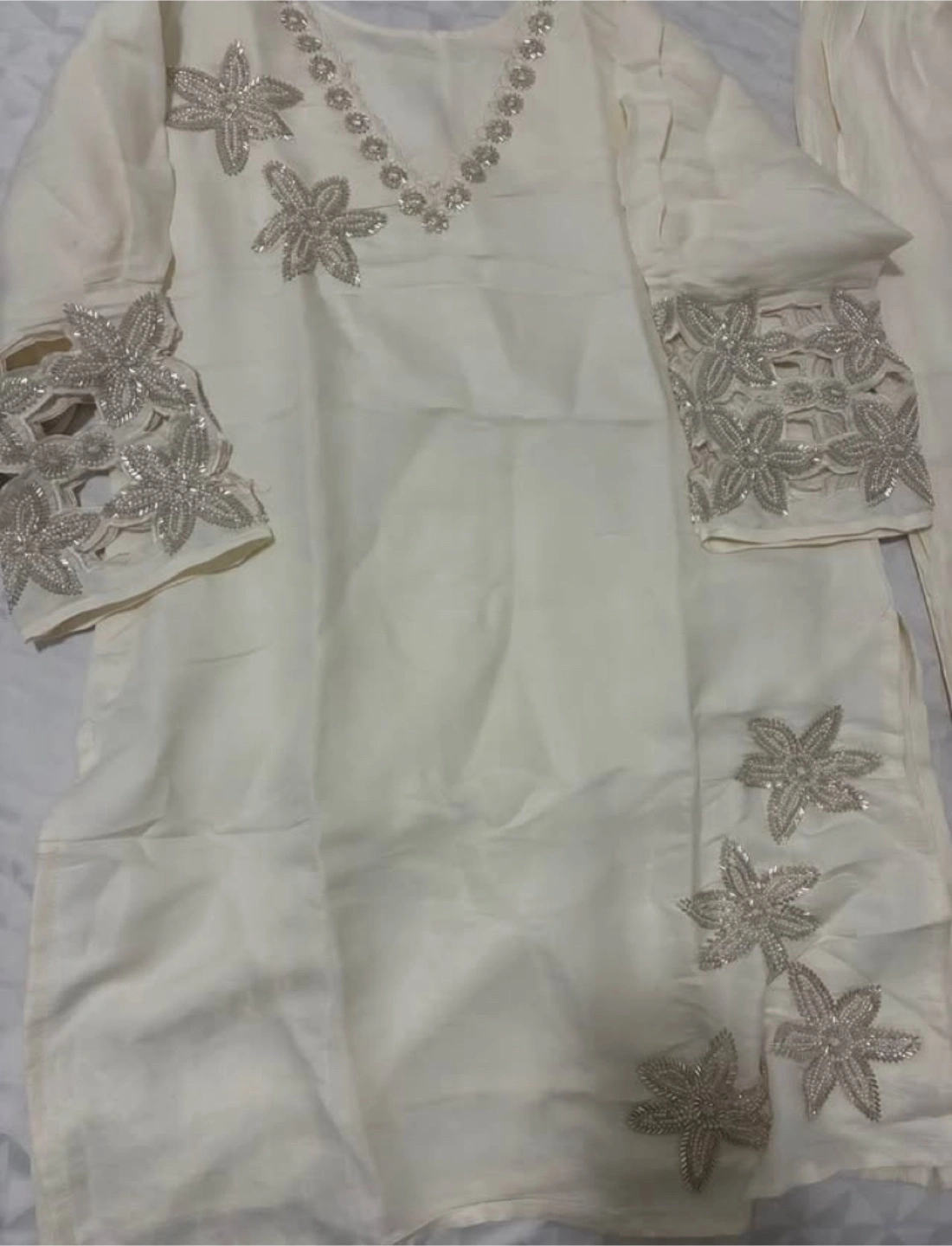 Here's a lovely cream-coloured salwar kameez. It features beautiful silver floral embroidery on the sleeves, neckline, and along the bottom of the kameez. Perfect for a special occasion!