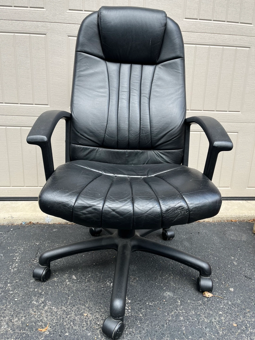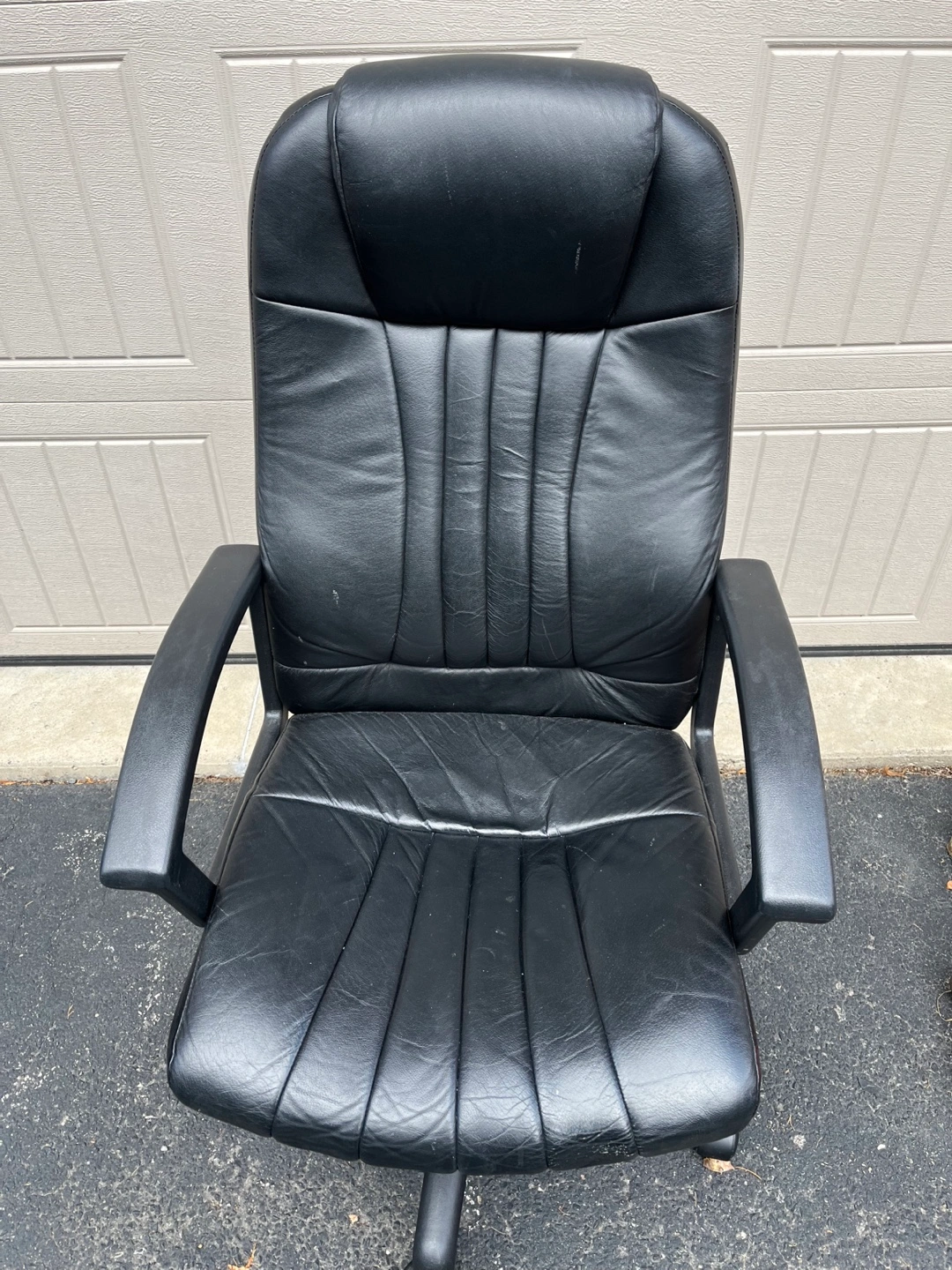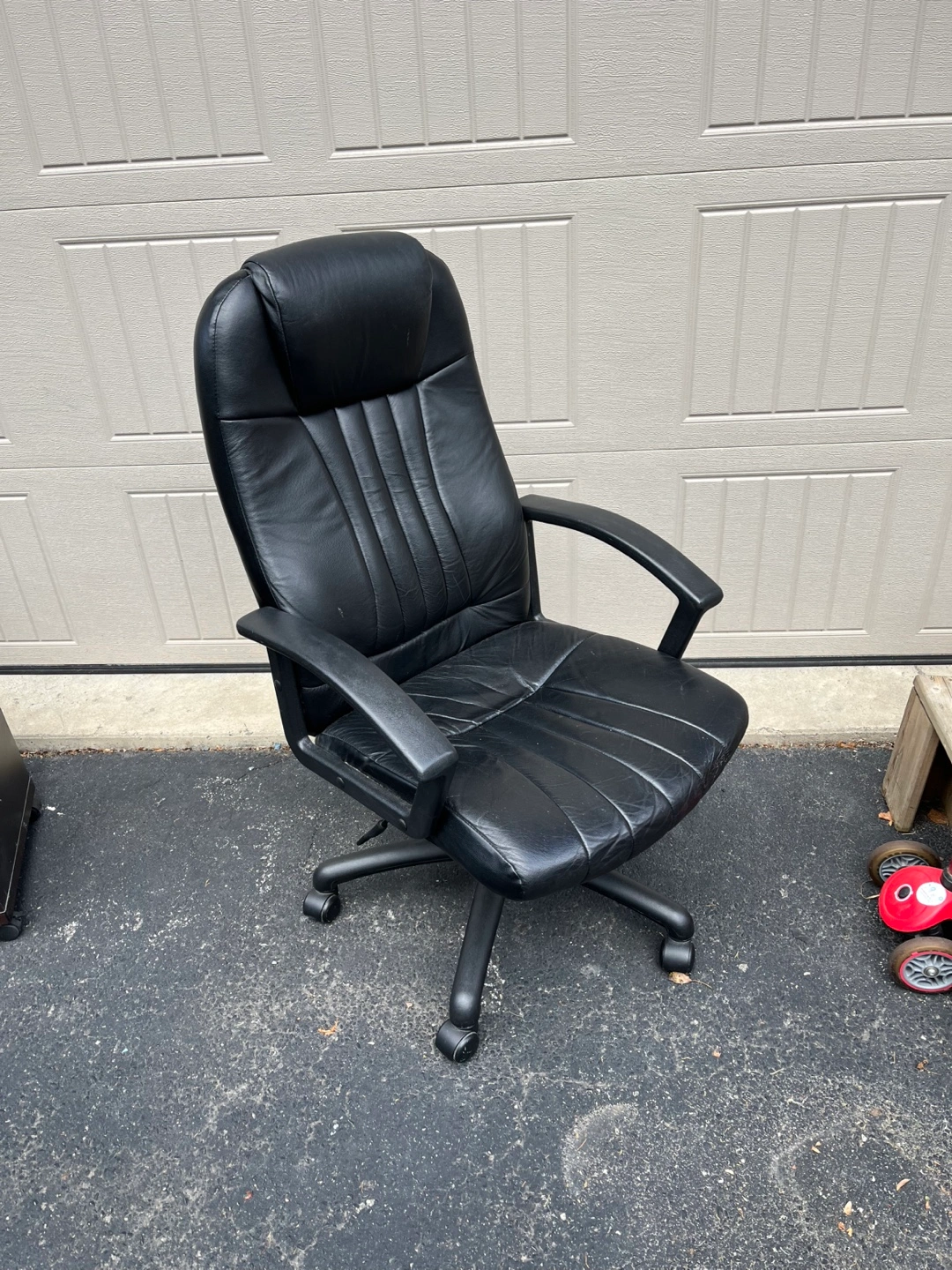 Selling a black leather office chair. It's in good condition and would be perfect for a home office or study space. The chair has a high back and padded armrests for extra comfort. It also features a swivel base and adjustable height