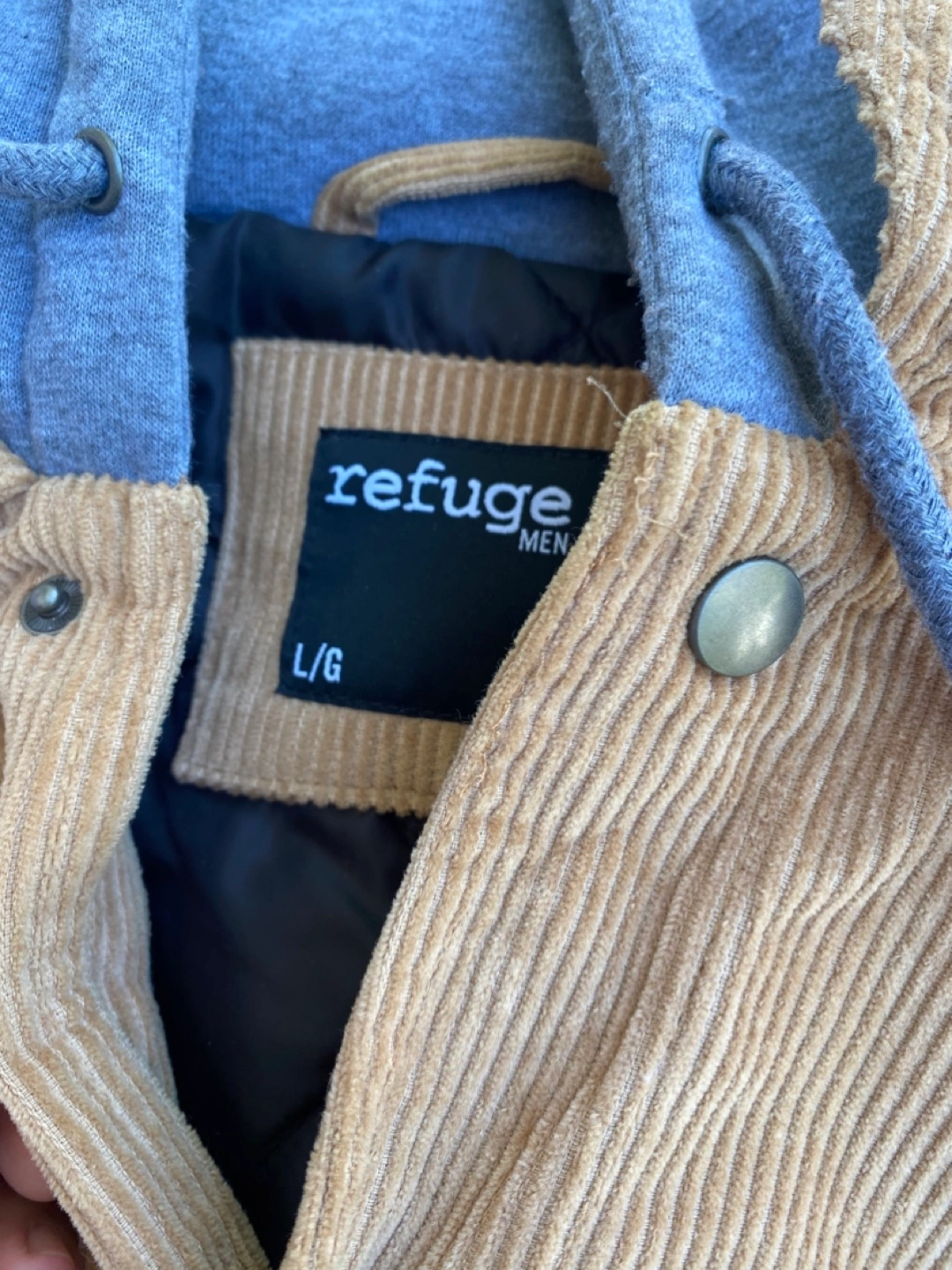 I'm selling a Refuge brand corduroy jacket for men. It's a size L/G and features a stylish corduroy texture. This jacket is perfect for adding a touch of classic style to your wardrobe!