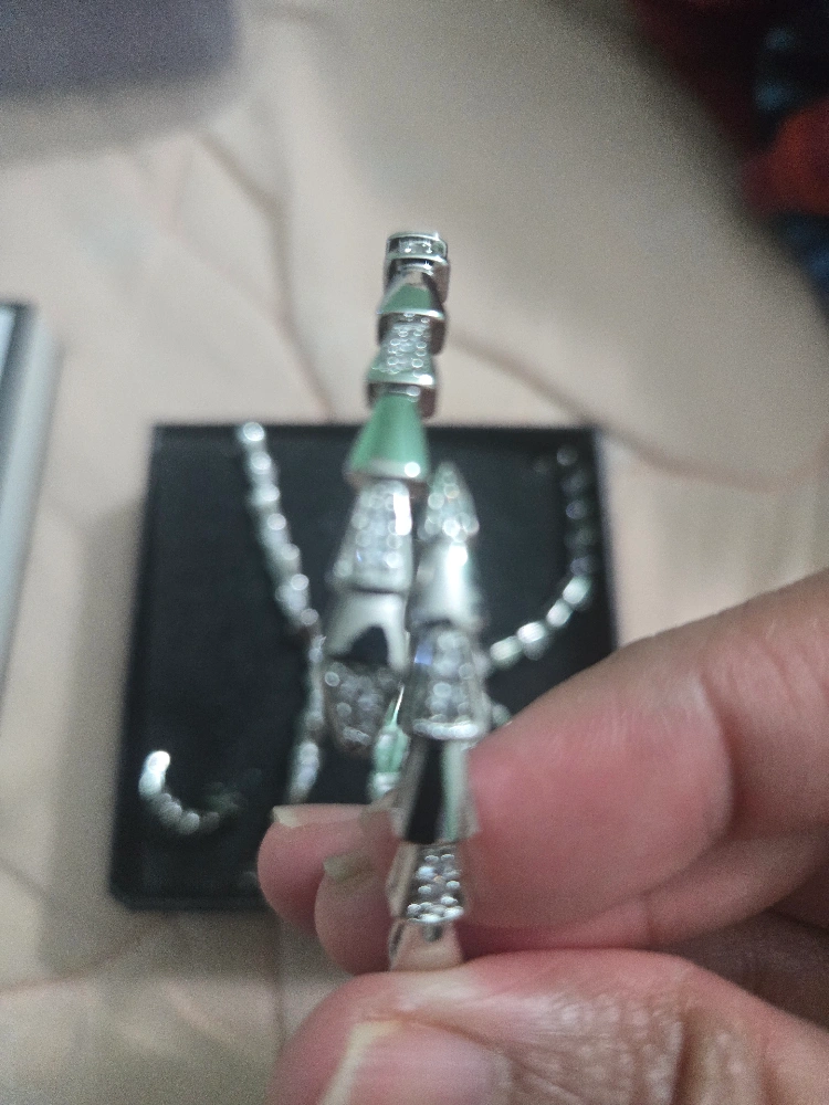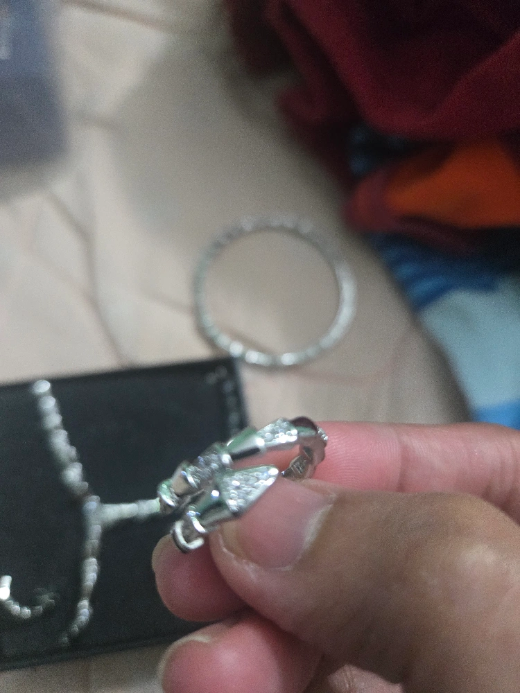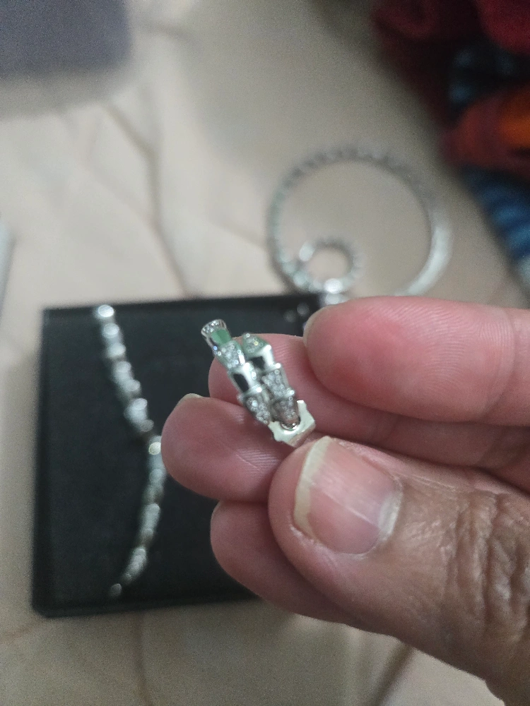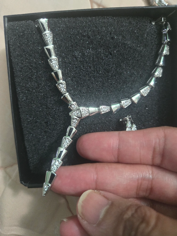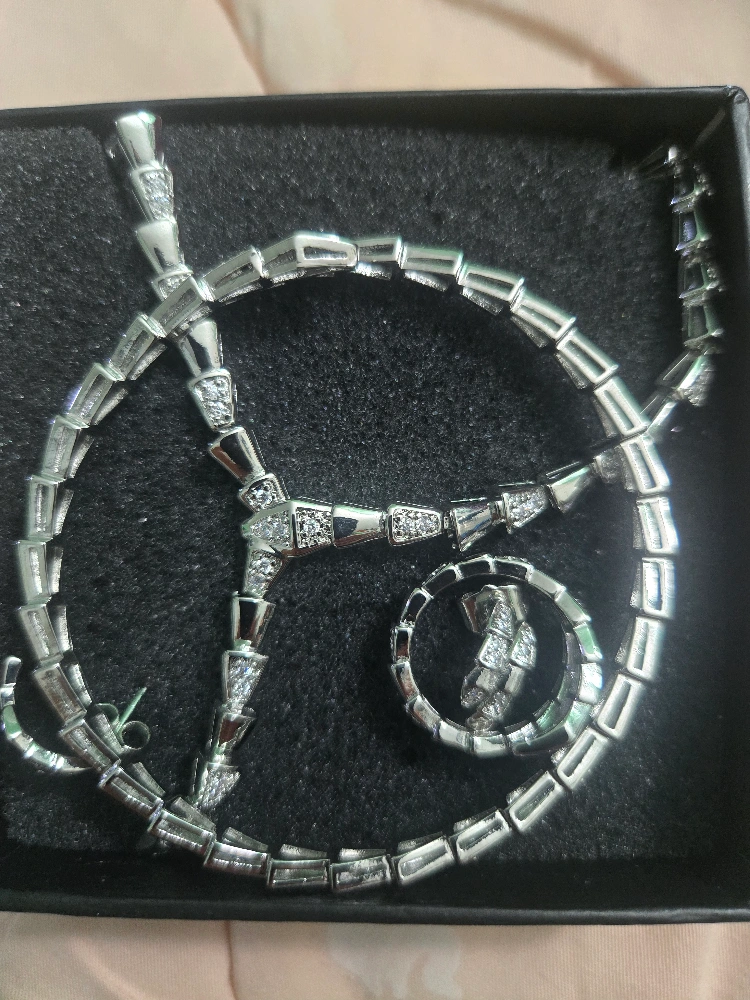36Selling a lovely silver-tone necklace and ring set. It comes in a box, perfect for gifting or keeping it safe. The set features a unique design with sparkling accents. A great addition to any jewelry collection! Japan purchased non tarnish new and not used perfect for parties and special event