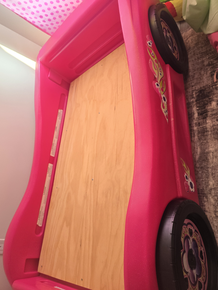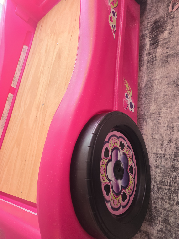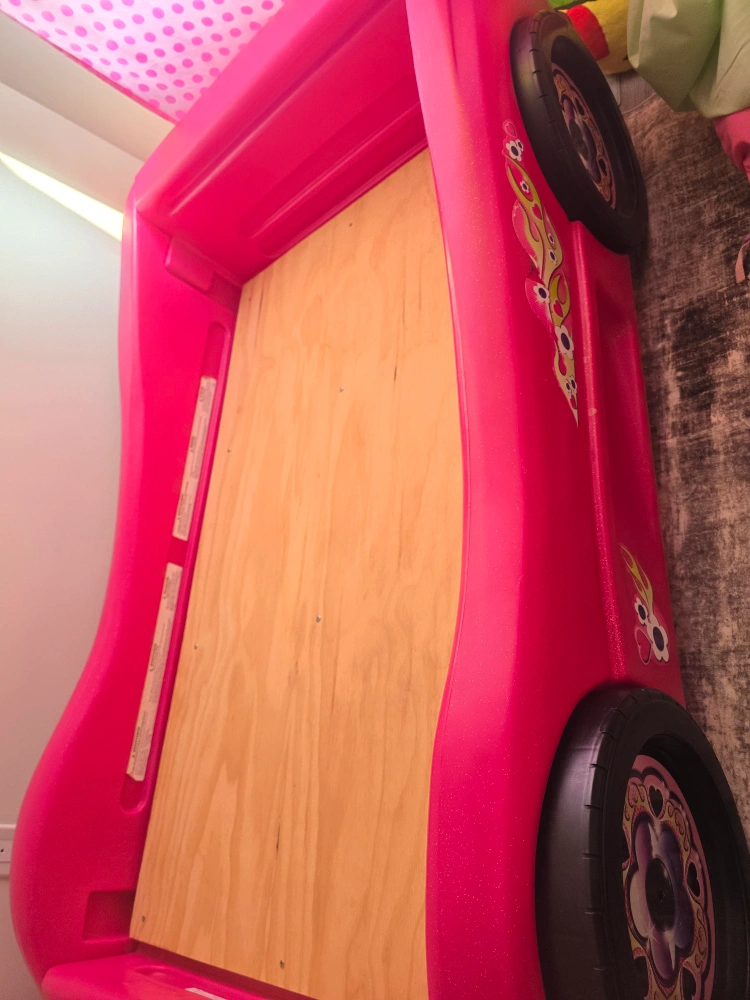Selling a cute pink car-shaped toddler bed! It's in great condition and ready for a new home. Perfect for transitioning your little one to their first big bed. It's a fun and playful design that any kiddo would love