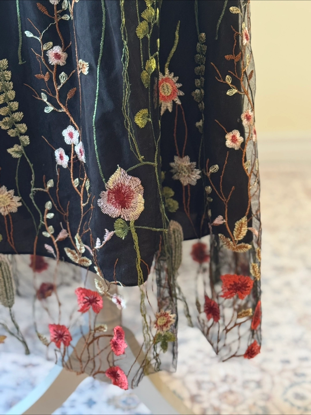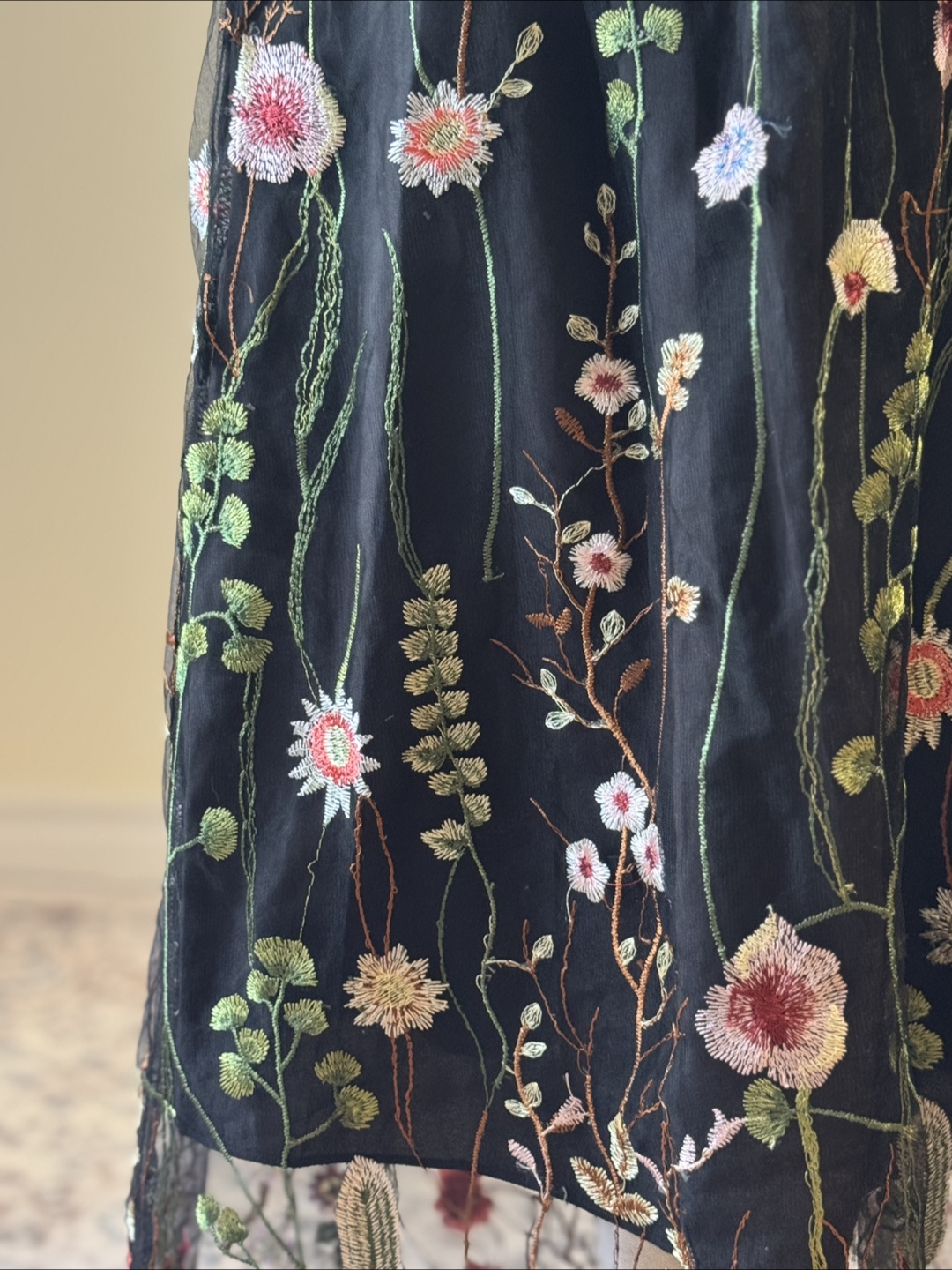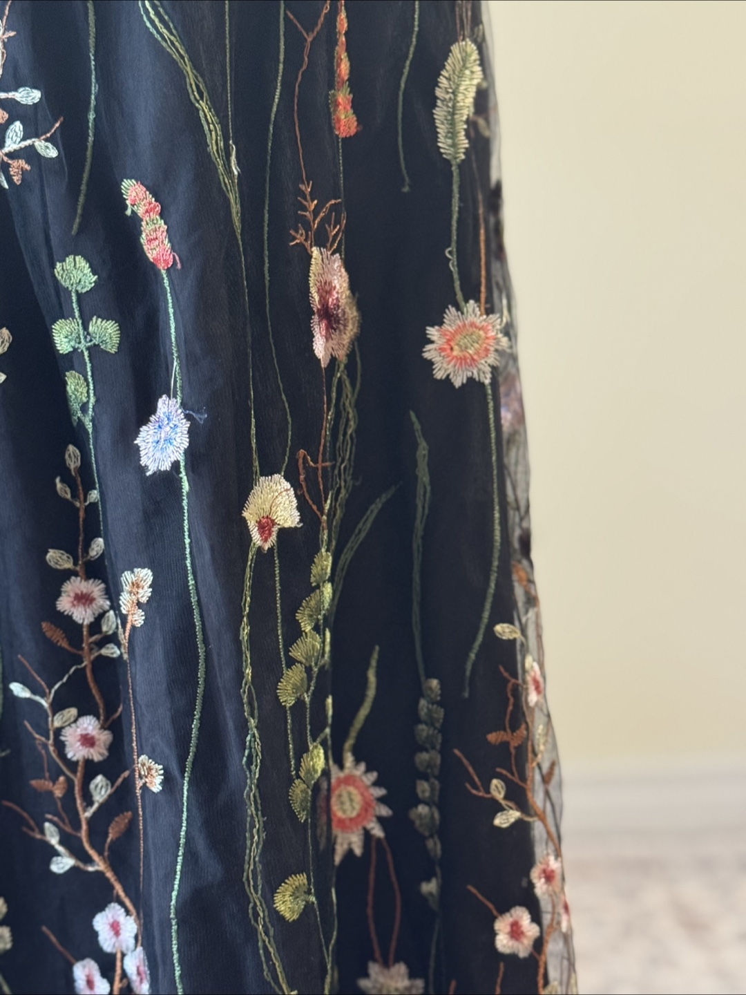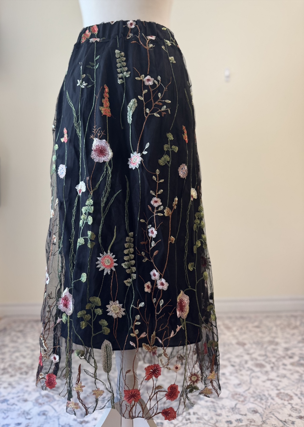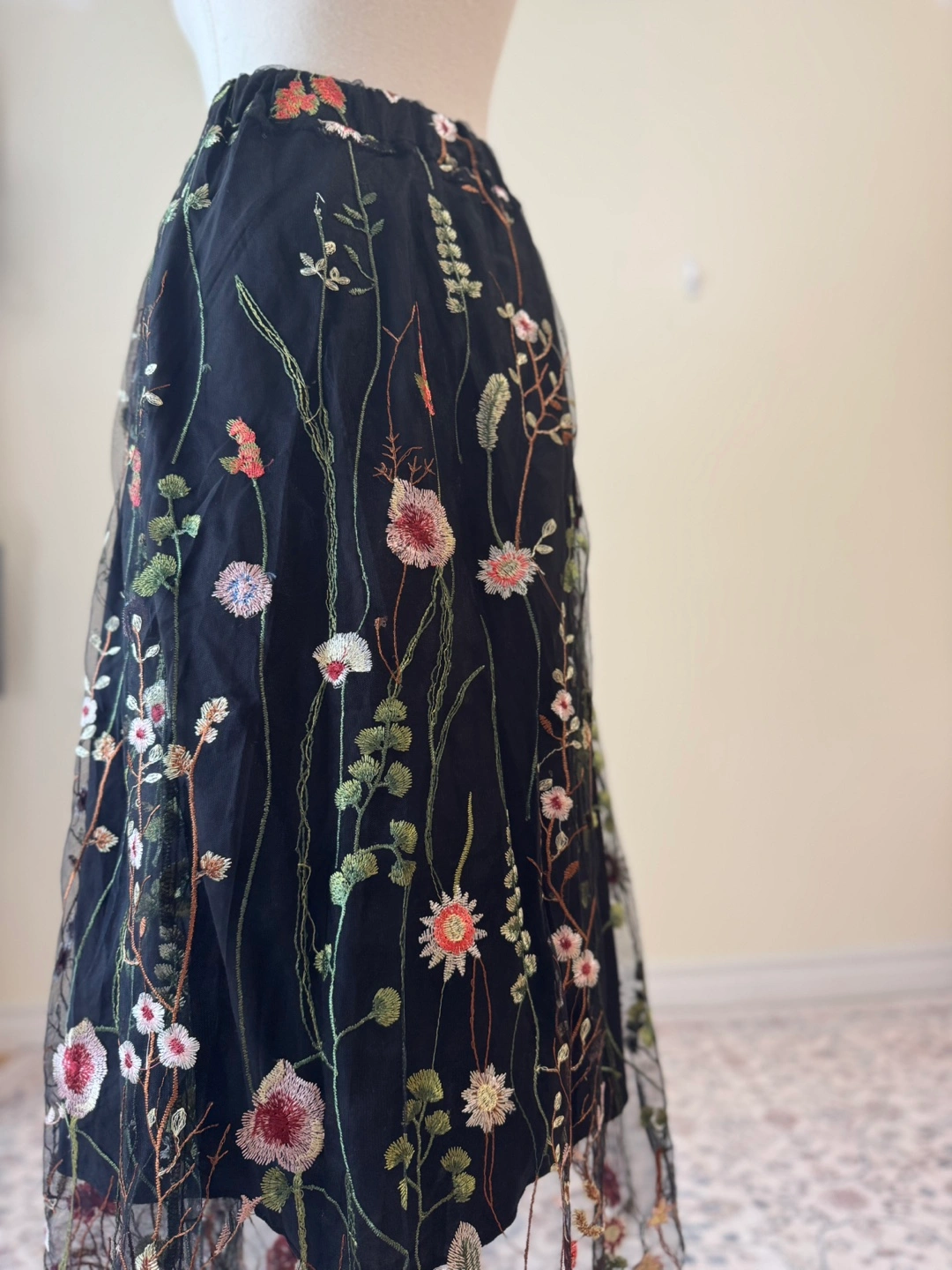 A stunning vintage embroidered mesh maxi skirt featuring intricate floral embroidery throughout. The sheer overlay creates a romantic, ethereal look, perfect for elevating your outfit for parties, weddings, or everyday boho chic styling. Its flowy silhouette and elegant embroidered details make it versatile for both casual and formal occasions.