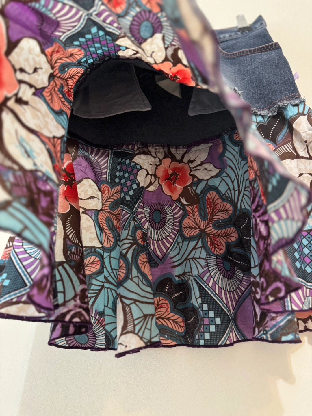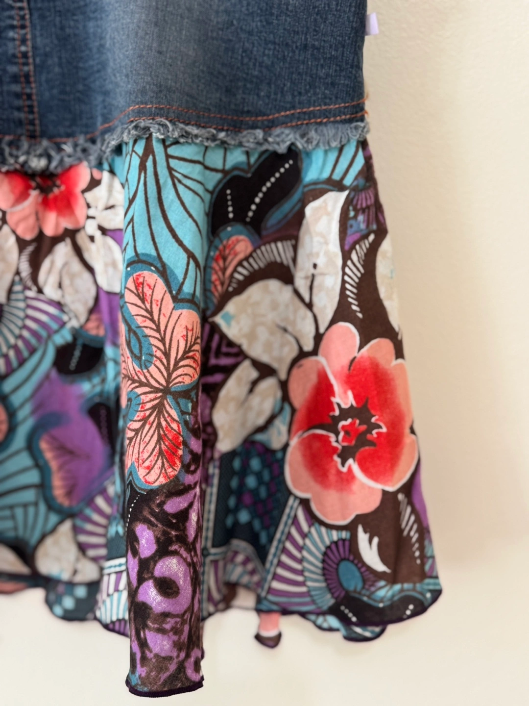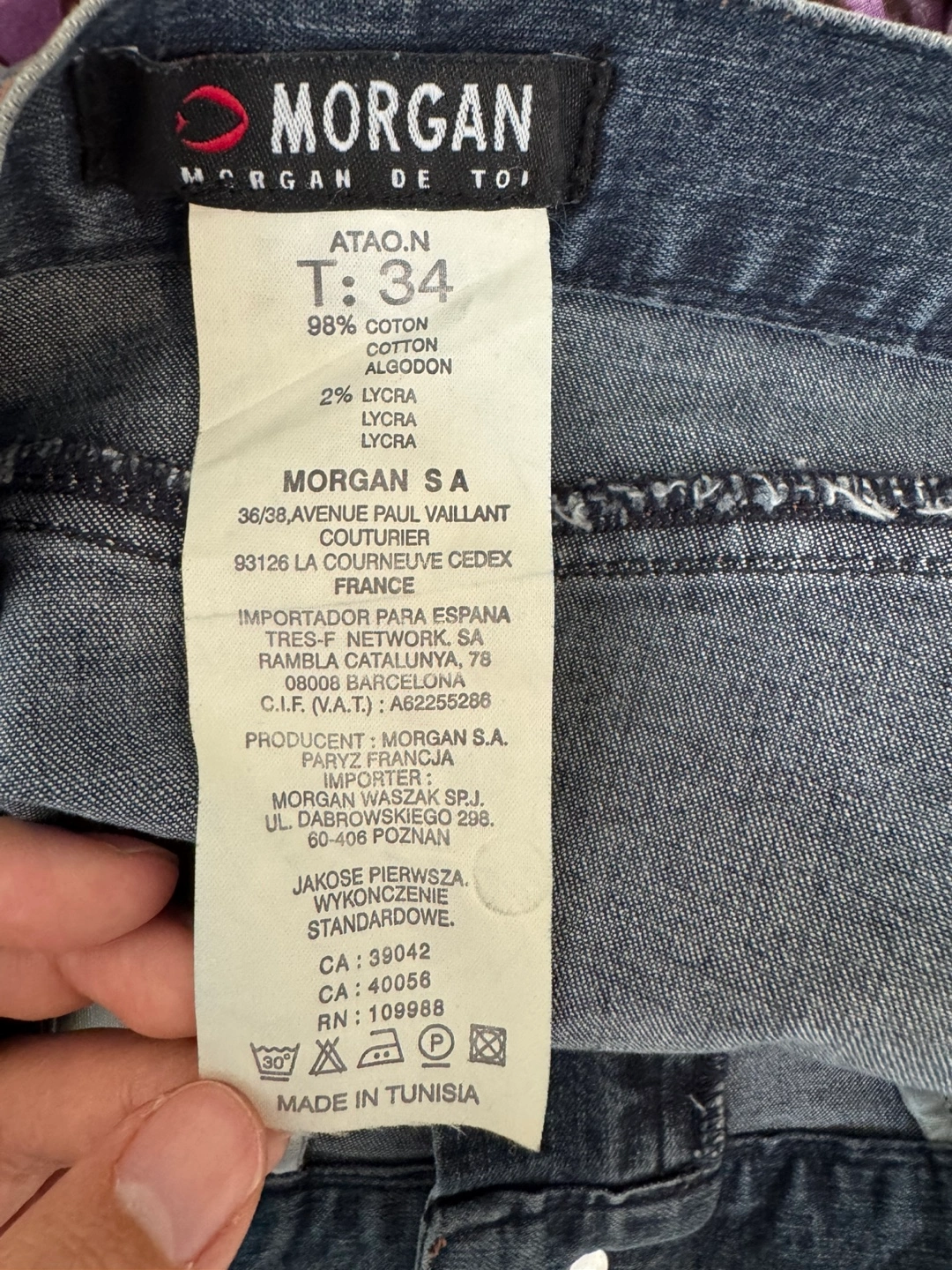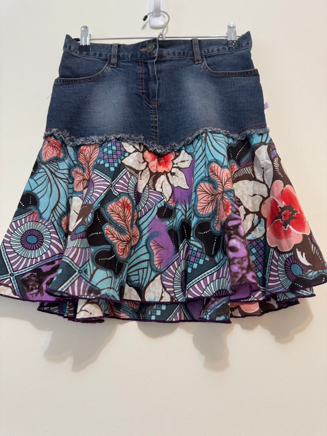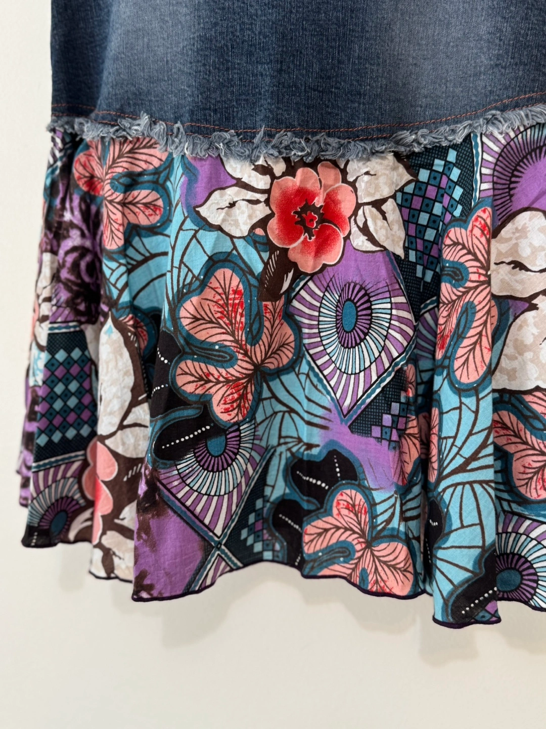 A unique vintage Morgan de Toi patchwork denim skirt combining a classic jean waistband with a bold, flared fabric hemline. The contrasting patchwork design gives it a playful, retro vibe, perfect for Y2K-inspired outfits, festivals, or casual streetwear. A rare find from the French label Morgan, known for its chic and youthful designs.