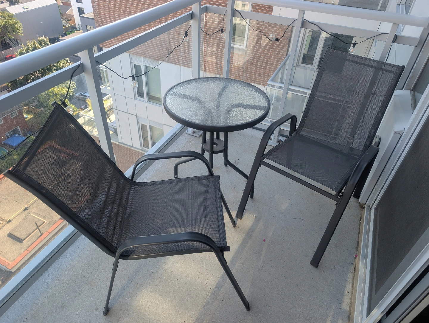 Selling a gently used outdoor patio set, perfect for a small balcony or patio! The set includes a round glass-topped table and two comfortable chairs.