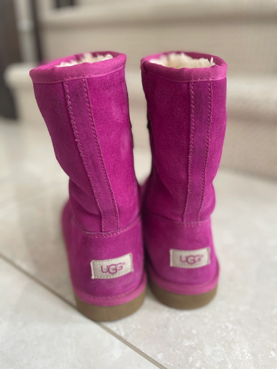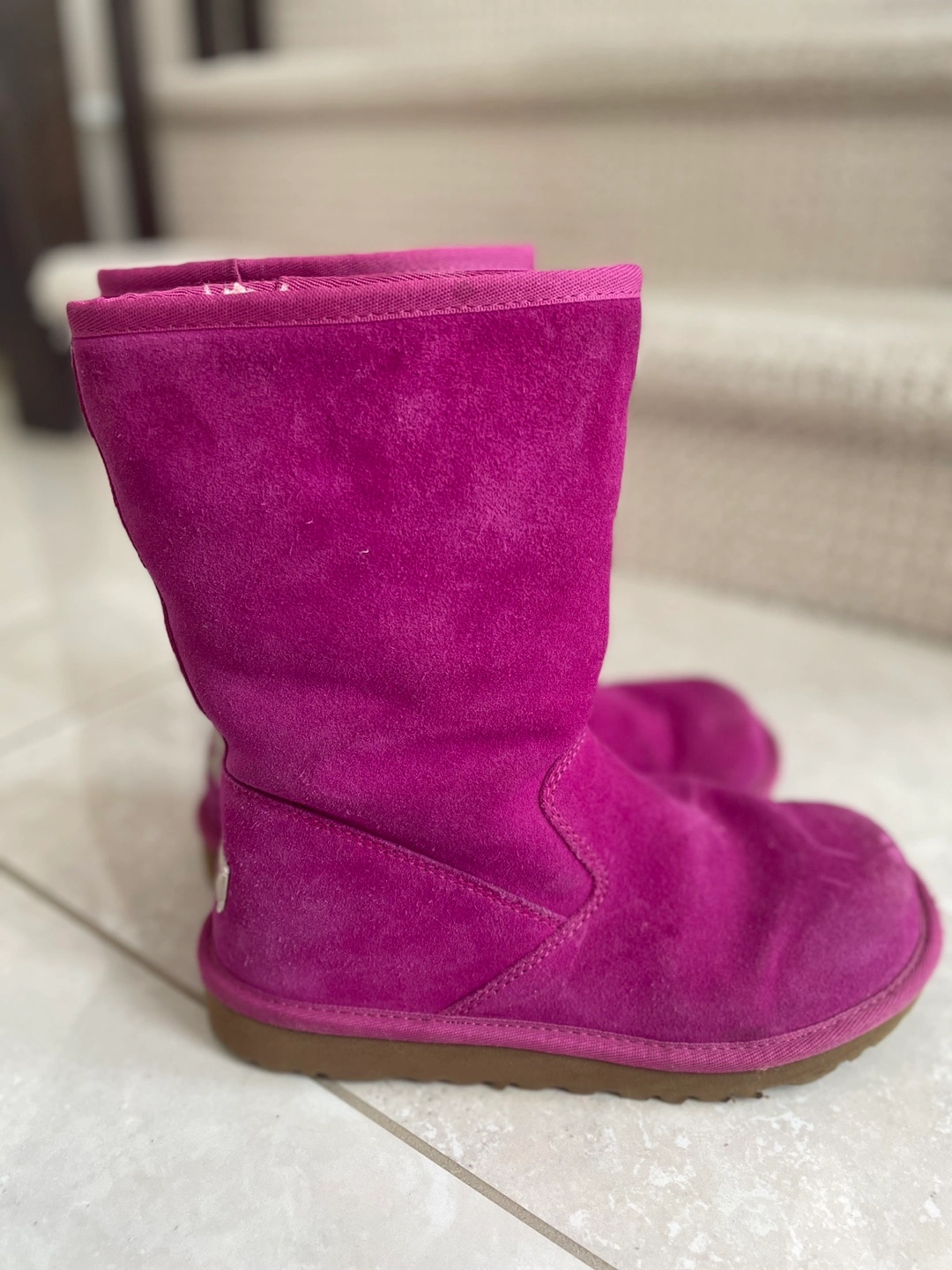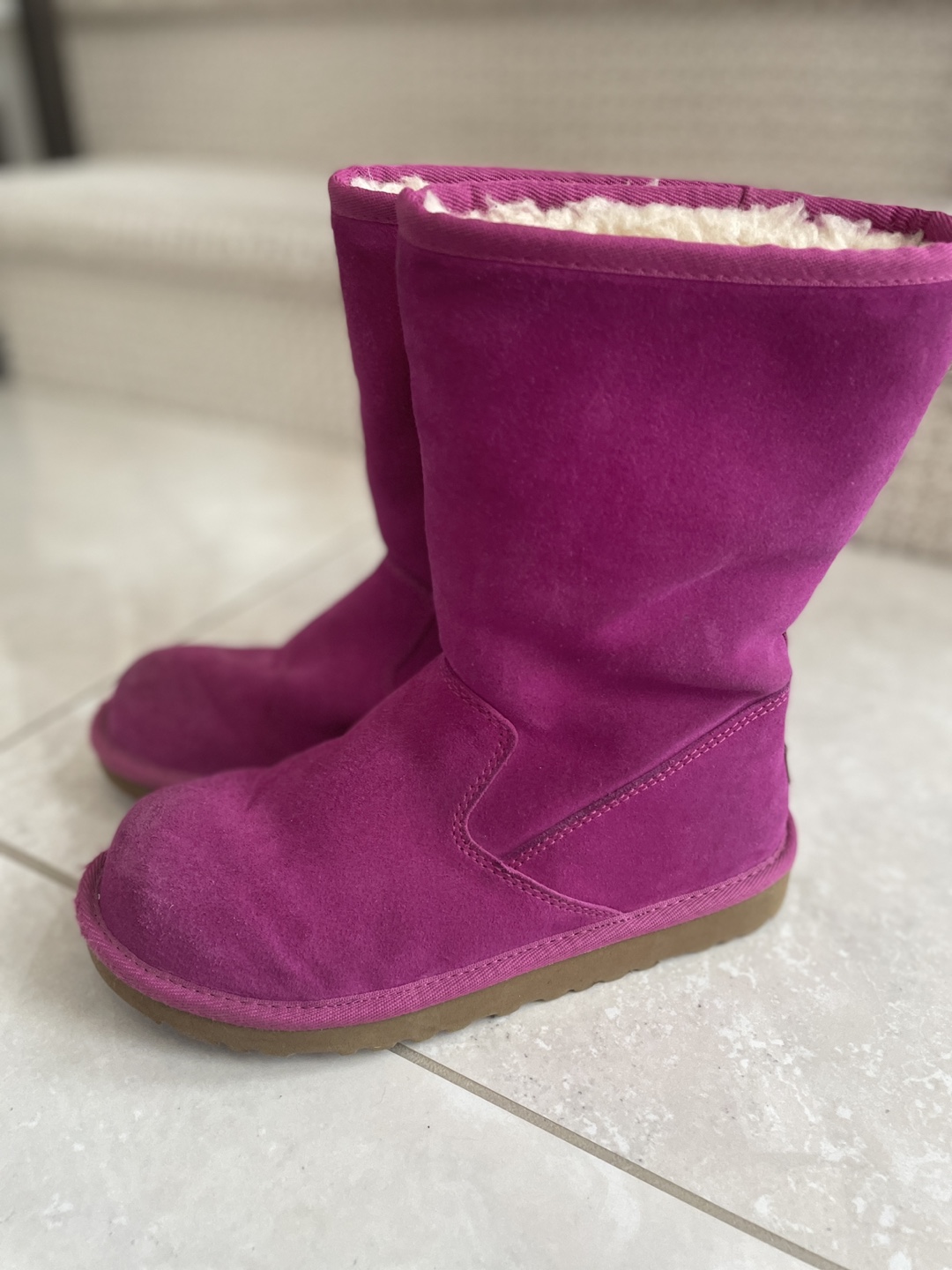 These cute UGG boots are perfect for kids! They are a vibrant pink colour and made of soft suede. The boots are pre-owned and show some signs of wear, but they're still in good condition for keeping little feet warm and stylish!
