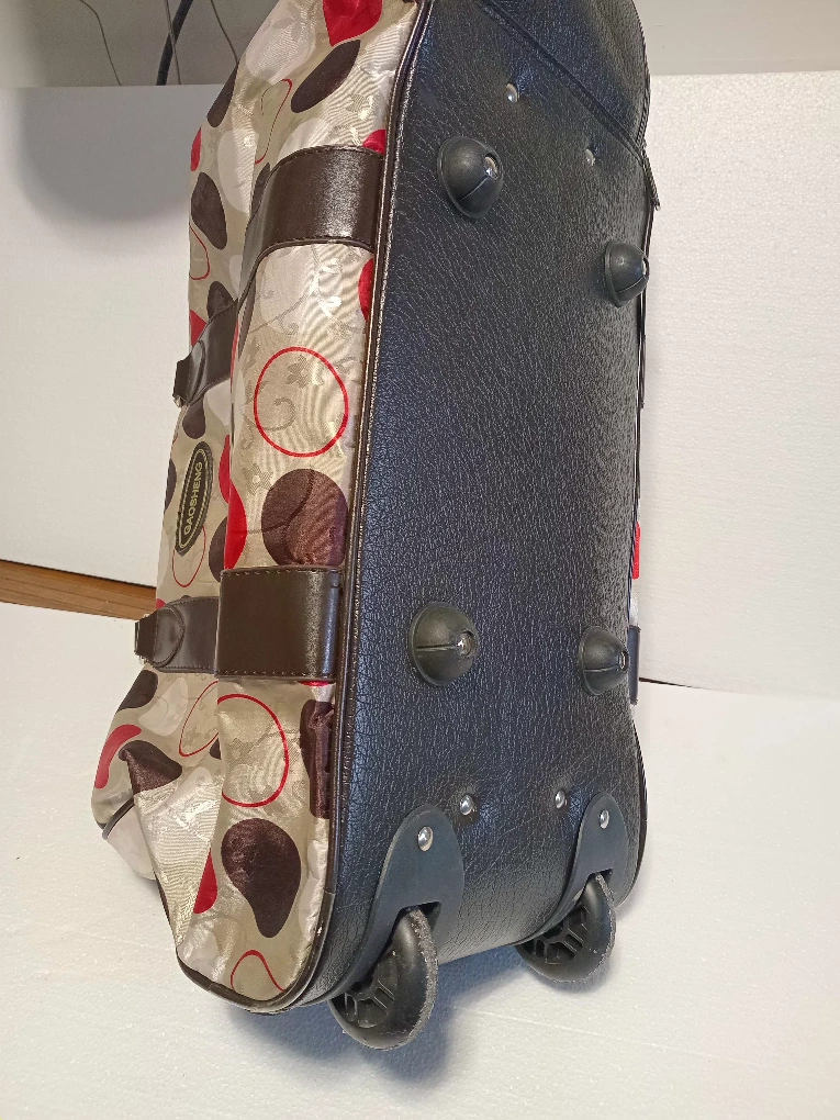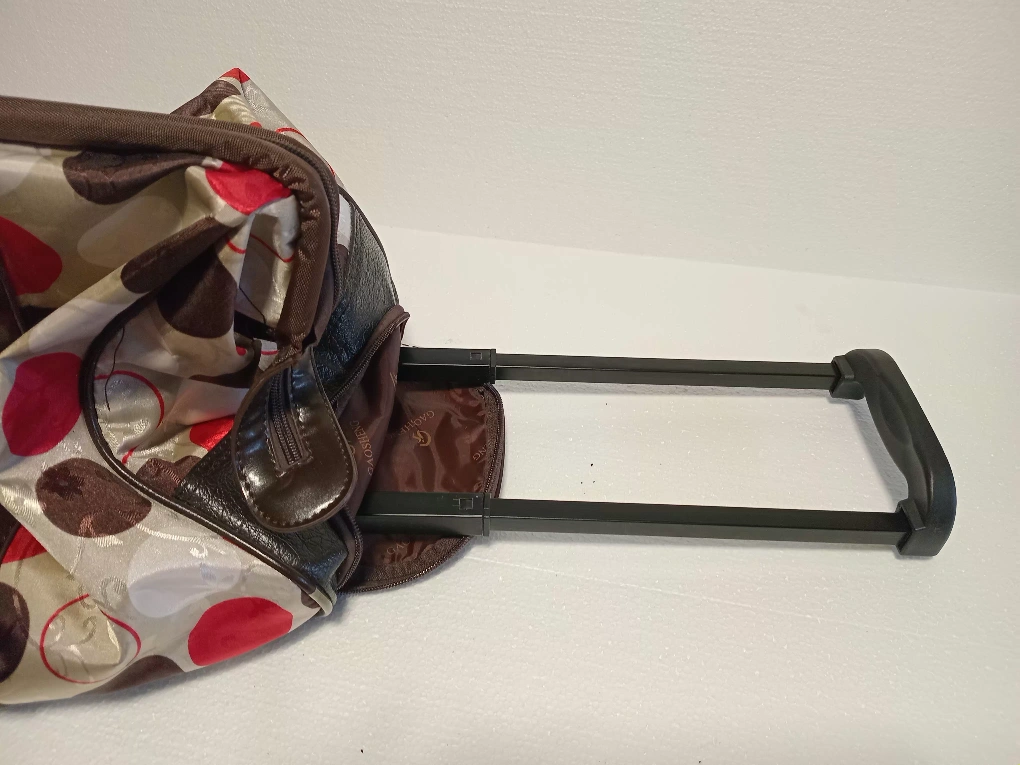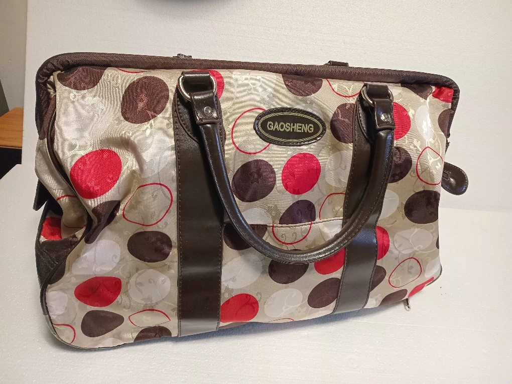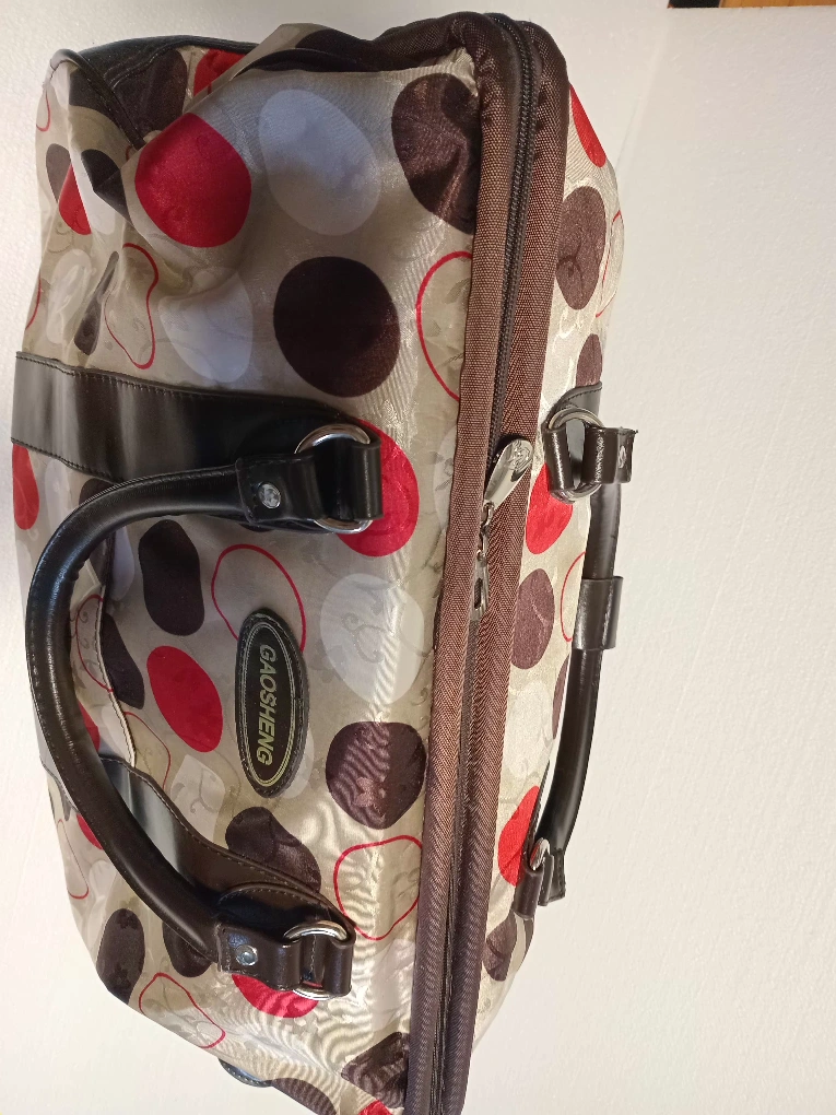 Looking to sell this GAOSHENG rolling duffle bag. It features a fun red and brown polka dot pattern. Perfect for travel or storage! Large capacity.