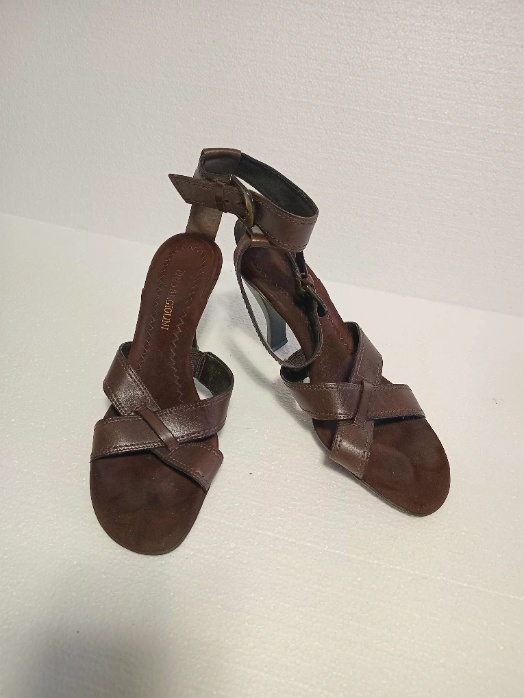 These are a pair of Bruno Magli heels in a beautiful brown leather. They feature a stylish ankle strap and are perfect for dressing up any outfit. They're in great condition and ready for a new home!