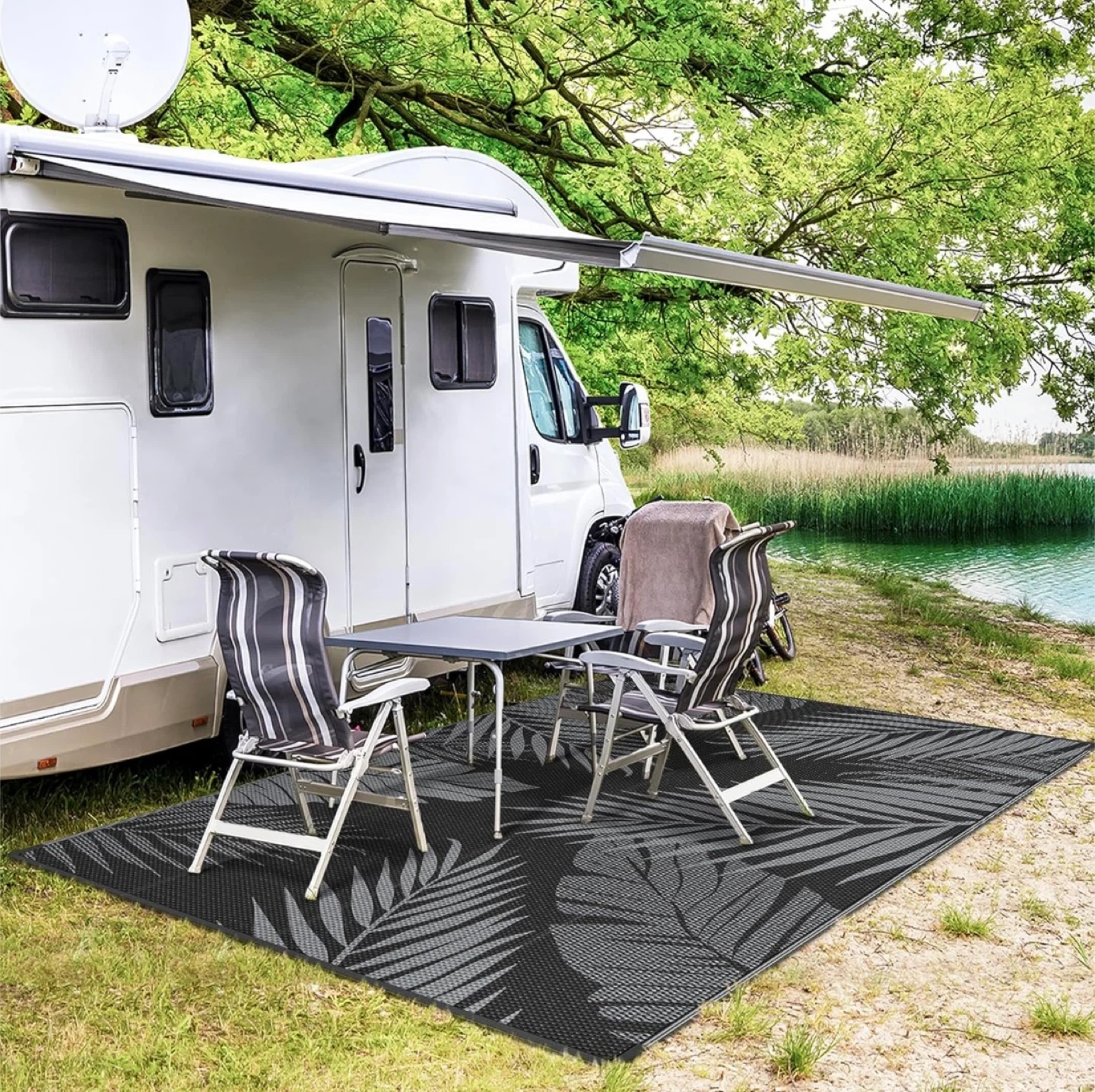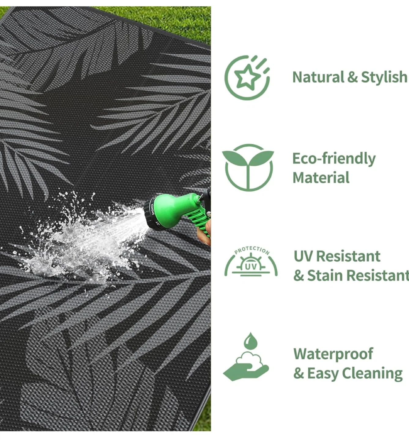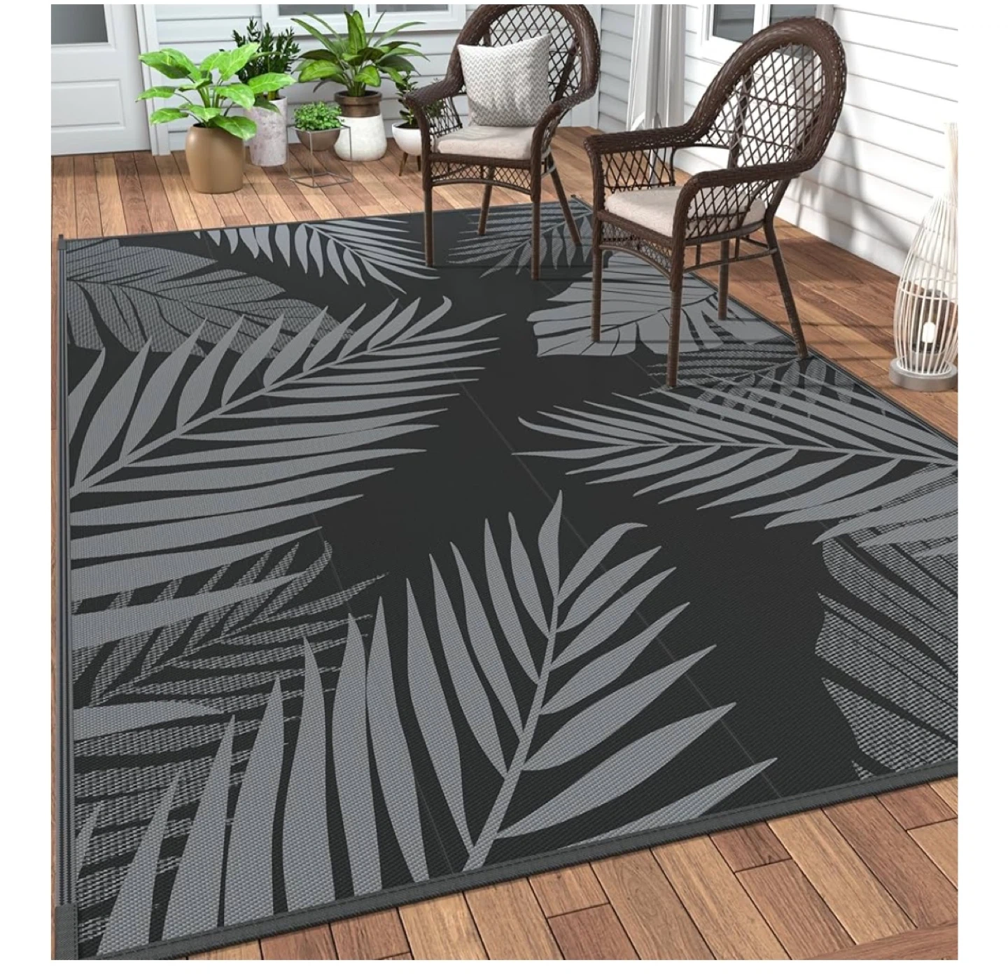 Add a touch of style to your outdoor space with this 6'x9' outdoor rug! It features a modern black and grey palm leaf design that will complement any patio, deck, or campsite. Perfect for creating a cozy and inviting atmosphere for your outdoor gatherings or relaxation