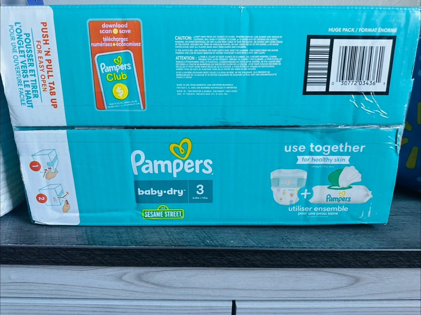 73Selling a box of Pampers Baby-Dry diapers, size 3. These are designed for babies weighing 16-28 lb (7-13 kg). The box contains 160 diapers. They feature 100% leakproof protection and ultra absorb layers to keep your baby dry and comfortable