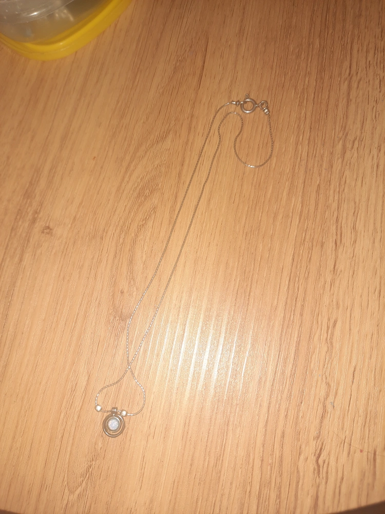 The object in the image is a silver necklace with a round pendant. The pendant features a circular design with a central white stone or bead.