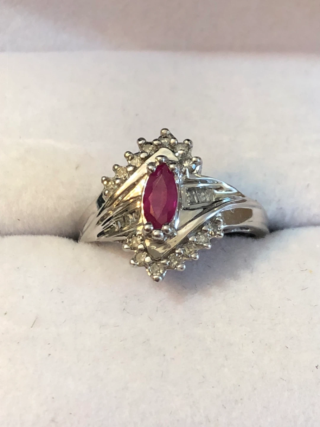 Selling a beautiful ruby and diamond ring. It features a marquise-cut ruby surrounded by diamonds. 10k white gold .New ! Perfect for a special occasion or as a lovely gift!