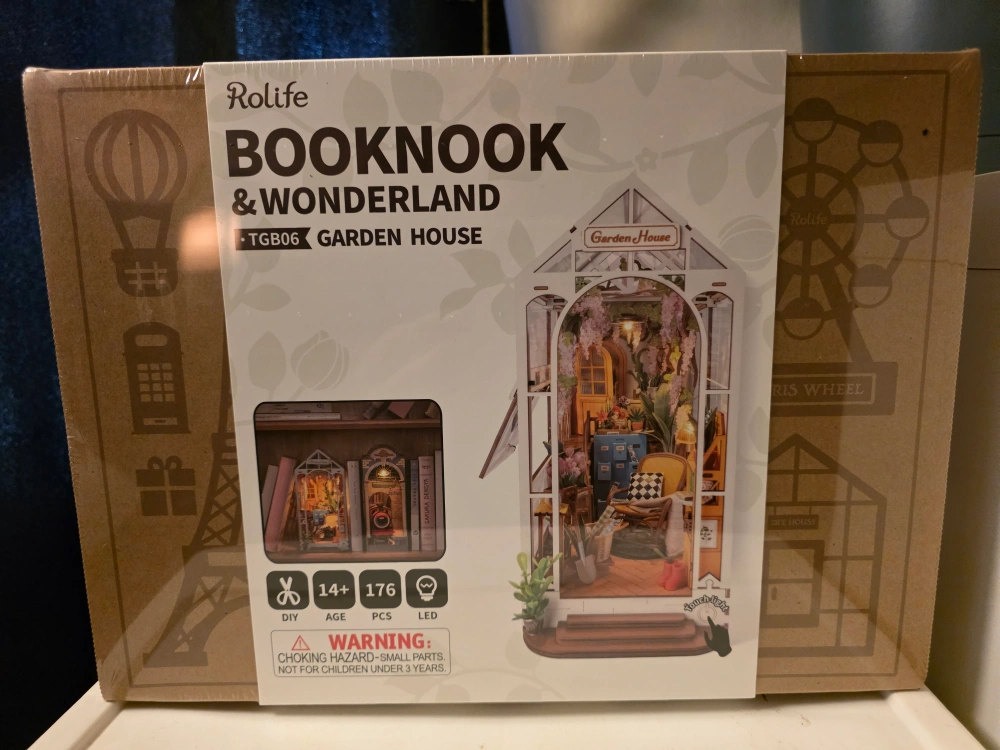 137I'm selling a brand new Rolife Book Nook & Wonderland Garden House (TGB06)! It's a fun assembly experience. The assembled size is 203*110*241mm. Recommended for ages 14+. Main materials are plywood, MDF board, and paper. Comes with 176 pieces and LED lights. The box is included