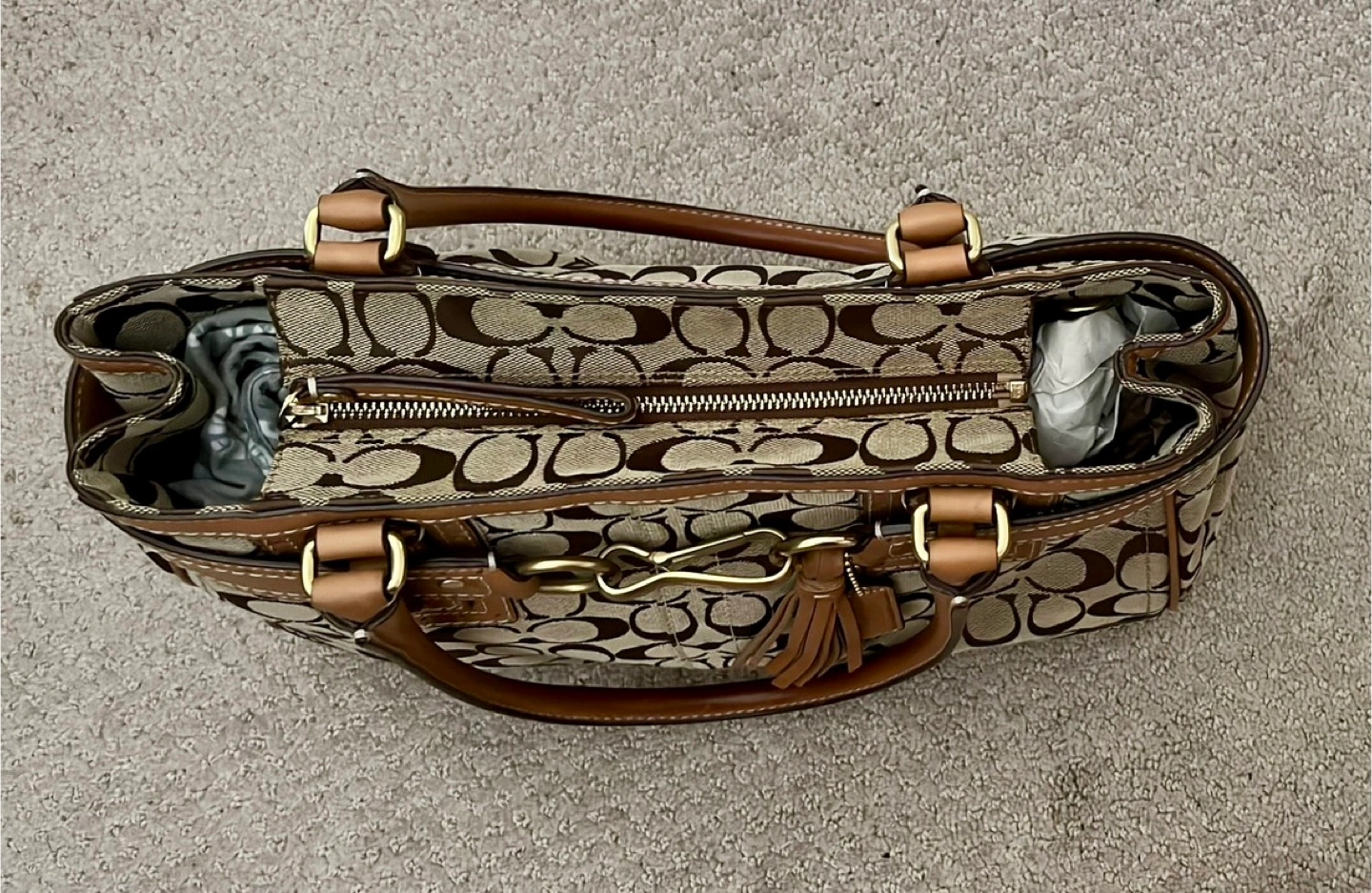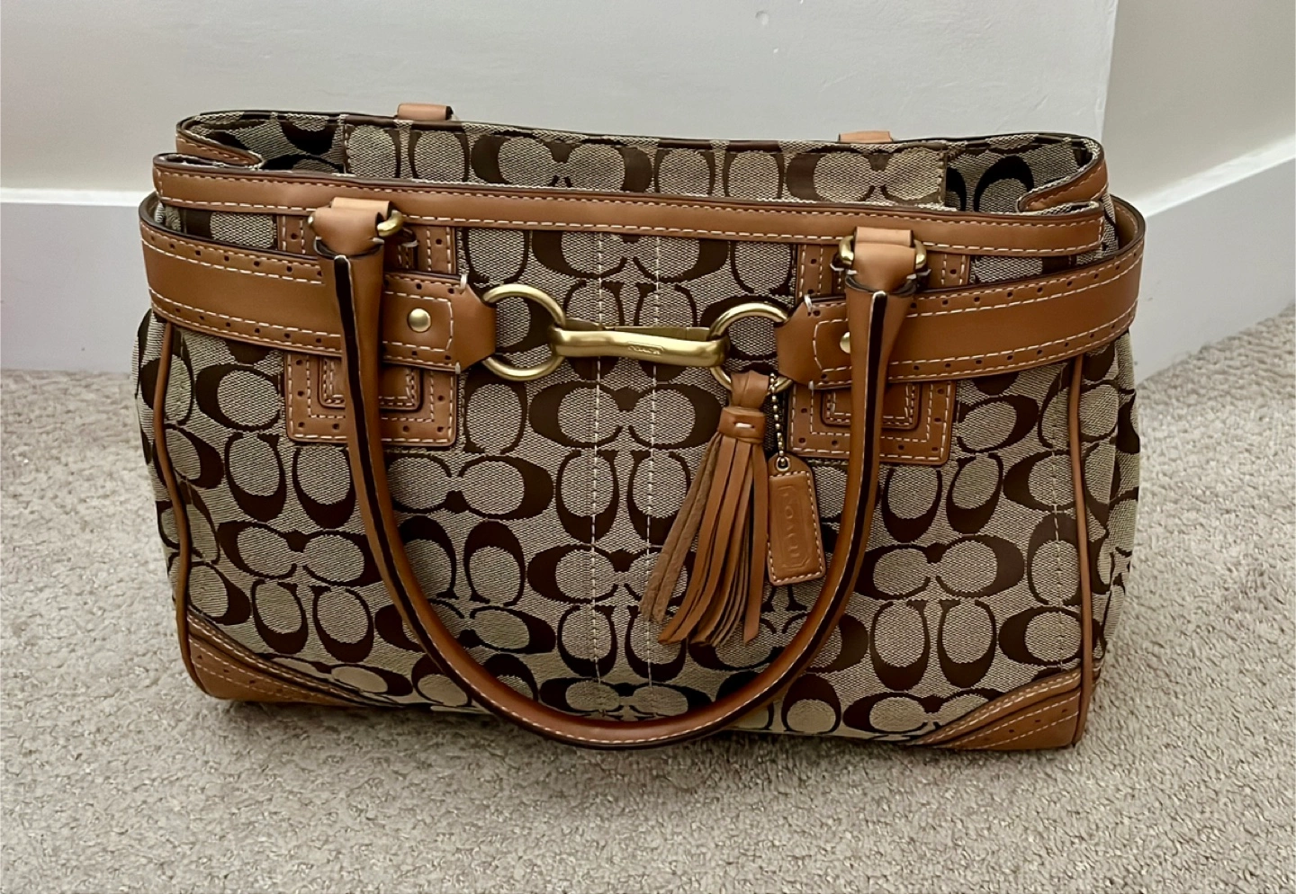 Selling a Coach handbag with the signature Coach pattern in brown and tan. It features brown leather trim and handles, along with gold-tone hardware. Great for everyday use!