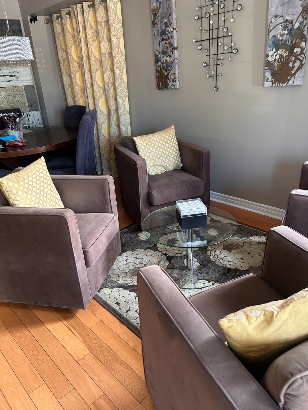 Selling a comfy brown swivel accent chairs!! in great condition and would be perfect for a living room or bedroom. The swivel feature makes it easy to turn and chat with guests or relax in any direction. These are custom chairs created by an interior designer.