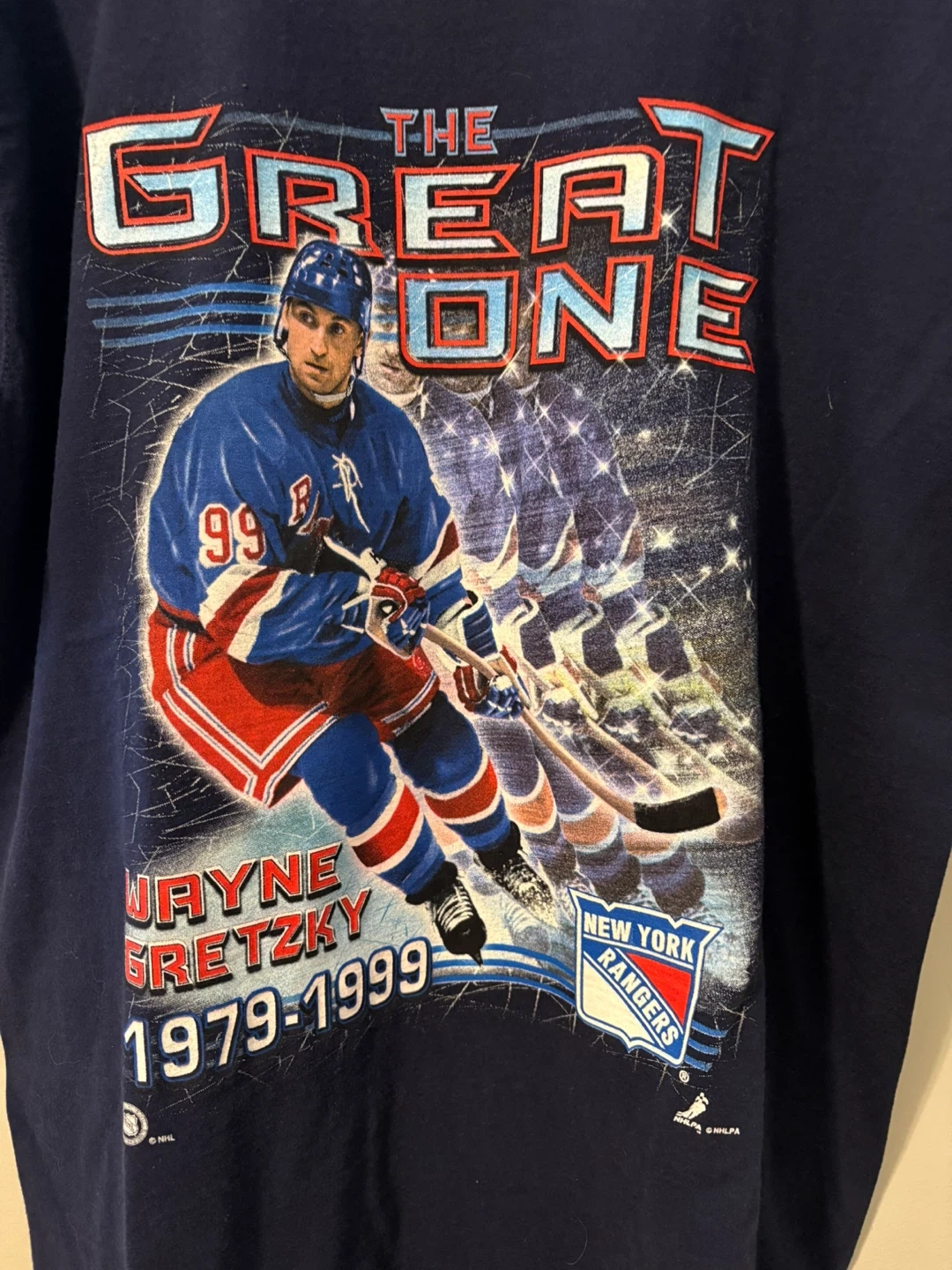 10Vintage Pro Player t-shirt featuring Wayne Gretzky, "The Great One", from his New York Rangers days (1979-1999) - Size: Large (G/G/L) - Colour: Navy Blue - Material: 100% Cotton Features: - All time leading scorer - More than 60 NHL records - 21 Professional Seasons - 4 Stanley Cup Championships - 9 Most Valuable Player Awards - 2 time Playoff MVP - 11 Scoring Titles - 4 Lady Byng Awards