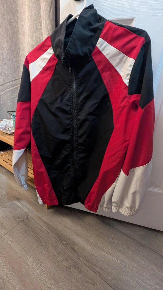 Selling a stylish windbreaker jacket featuring a cool colour block design with red, black, and white panels. It's perfect for those breezy days or as a light layer for outdoor activities. It's in great condition and ready for a new home!