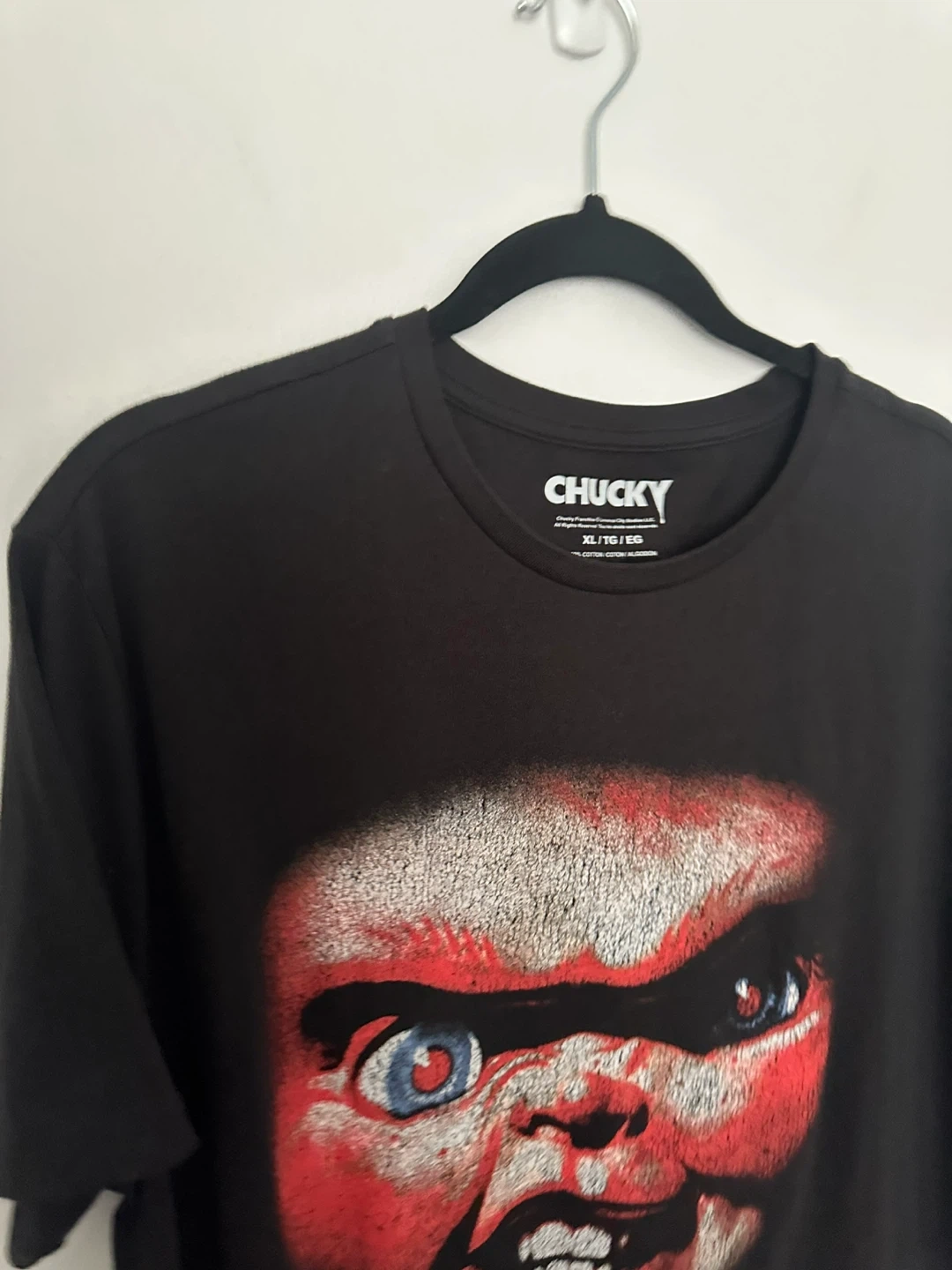 Selling a Chucky 'Wanna Play' T-shirt. It's a black tee with a print of Chucky on the front. The size is XL and it's made of 60% cotton and 40% polyester