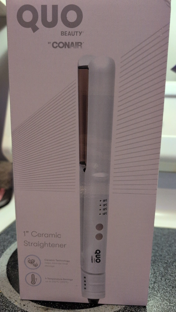 Selling a QUO Beauty 1" ceramic straightener made by Conair! It features ceramic technology to help minimize heat damage and has 4 temperature settings up to 200°C (395°F).
