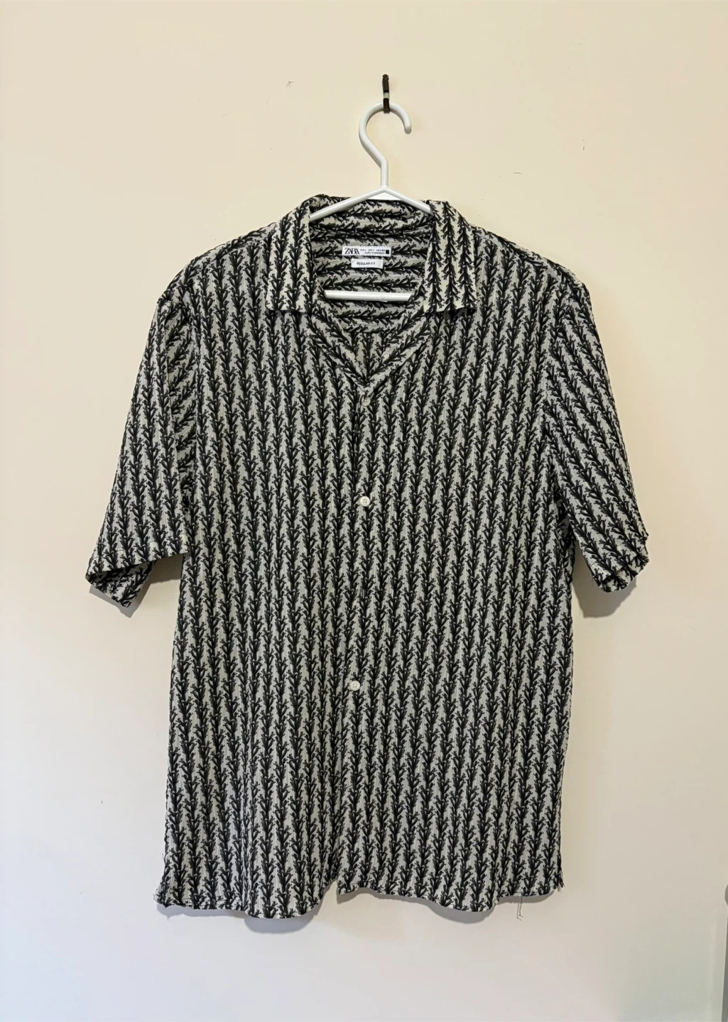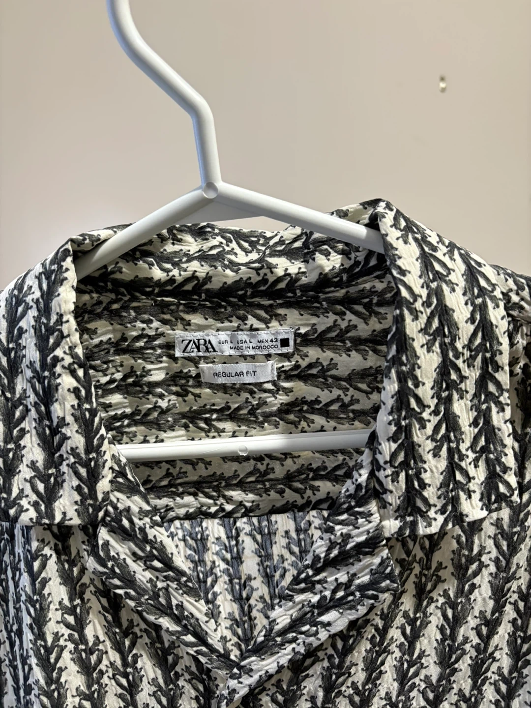 10Selling a Zara Man shirt in size L/42. It features a unique black and white patterned design and is in great condition. It's a regular fit shirt, perfect for casual wear