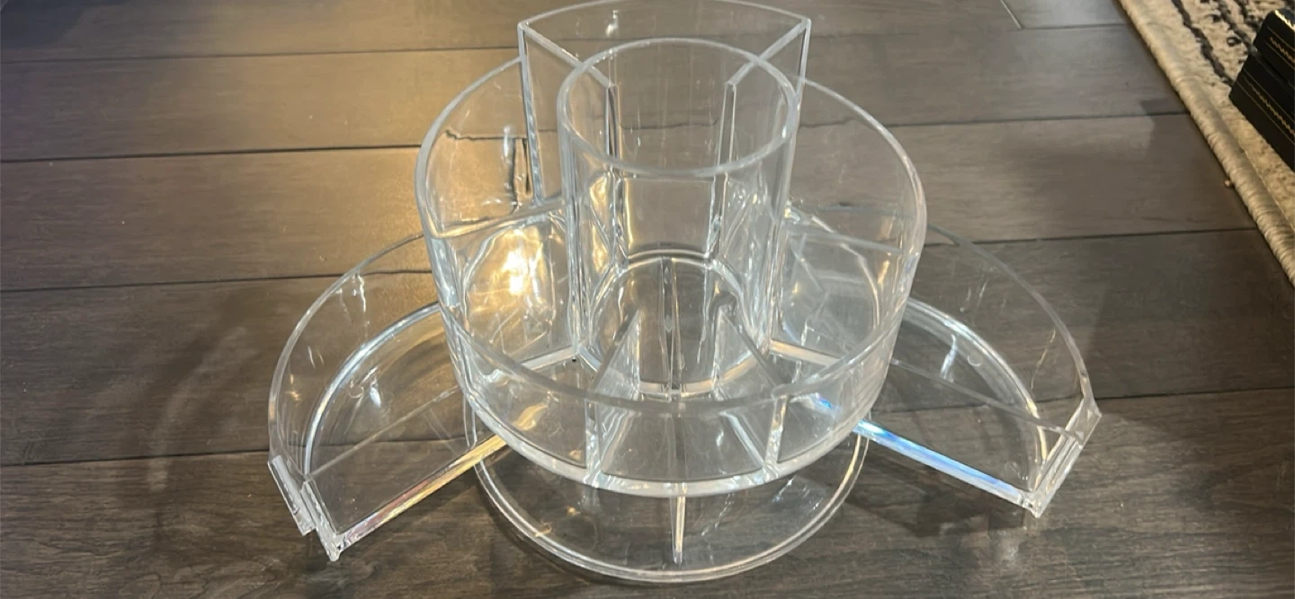 Clear acrylic makeup organizer. It's in great condition and perfect for keeping all your cosmetics neatly organized!