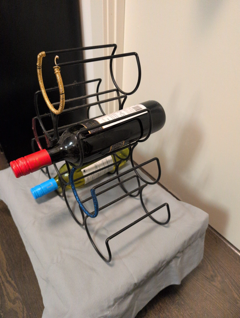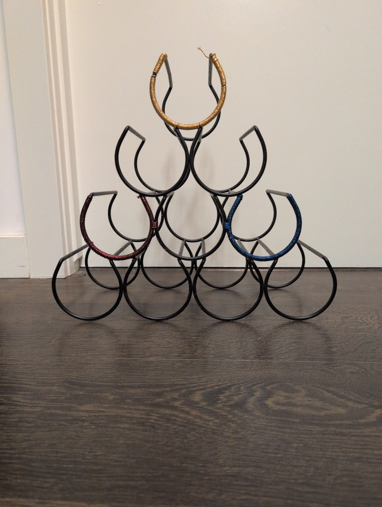 Selling a black metal wine rack that holds 10 bottles. 3 of the circles are wrapped in metallic garland which adds a festive spin. it can be removed if you festivities aren't your thing 😋.