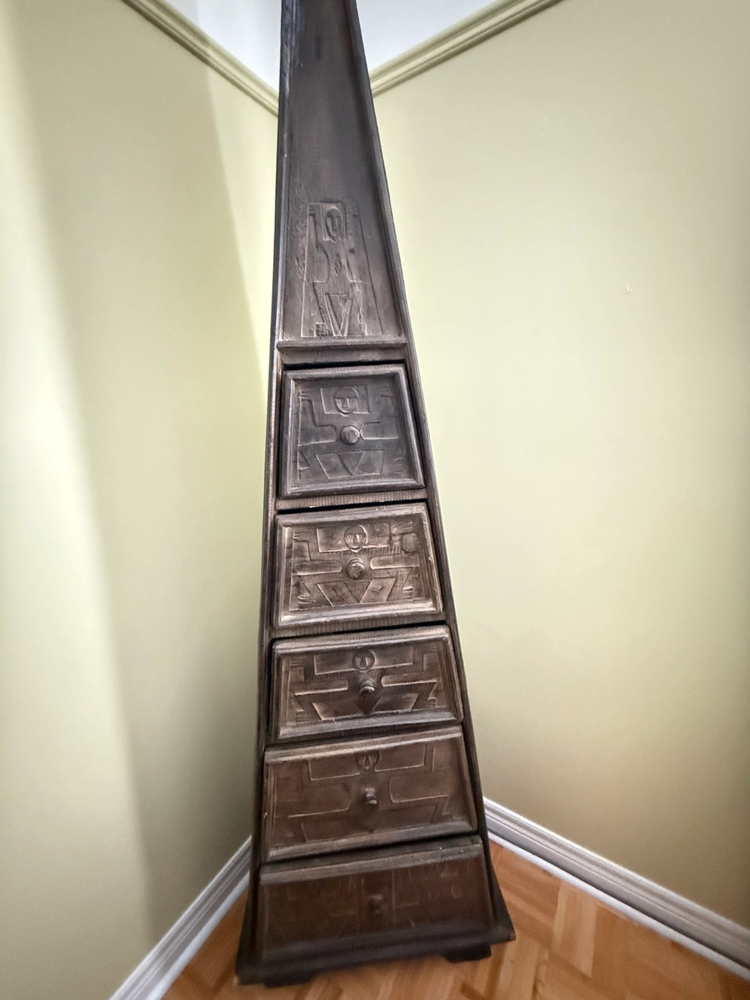 Selling a unique pyramid-shaped drawer cabinet! It has a distinctive design and would make a great conversation piece in any room. It has a dark colour and has 5 drawers.