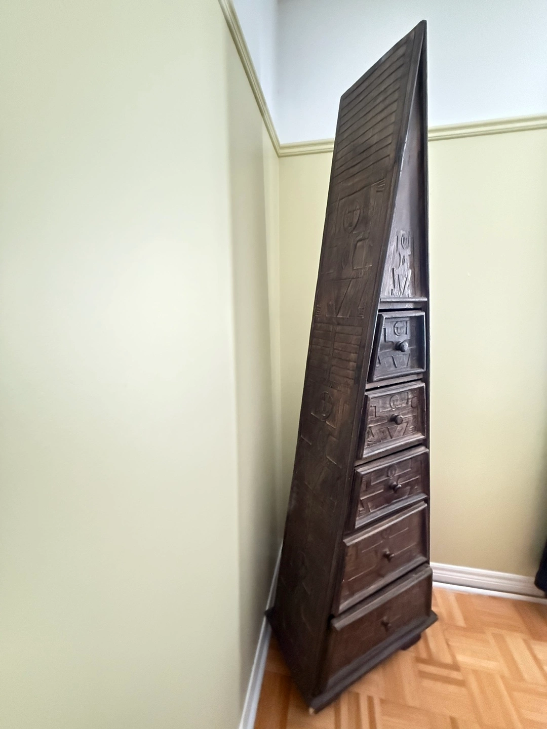 Selling a unique pyramid-shaped drawer cabinet! It has a distinctive design and would make a great conversation piece in any room. It has a dark colour and has 5 drawers.