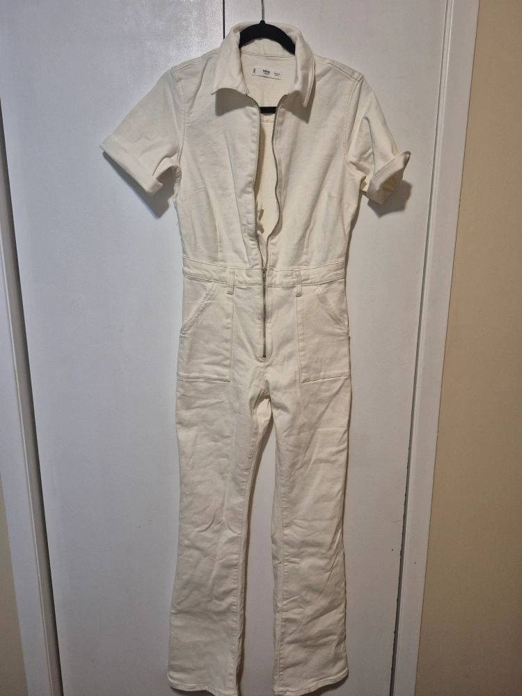 Selling a cute Mango jumpsuit in off-white denim! It features a collared neckline and a zip-up front. Perfect for a casual day out or dressed up with some accessories