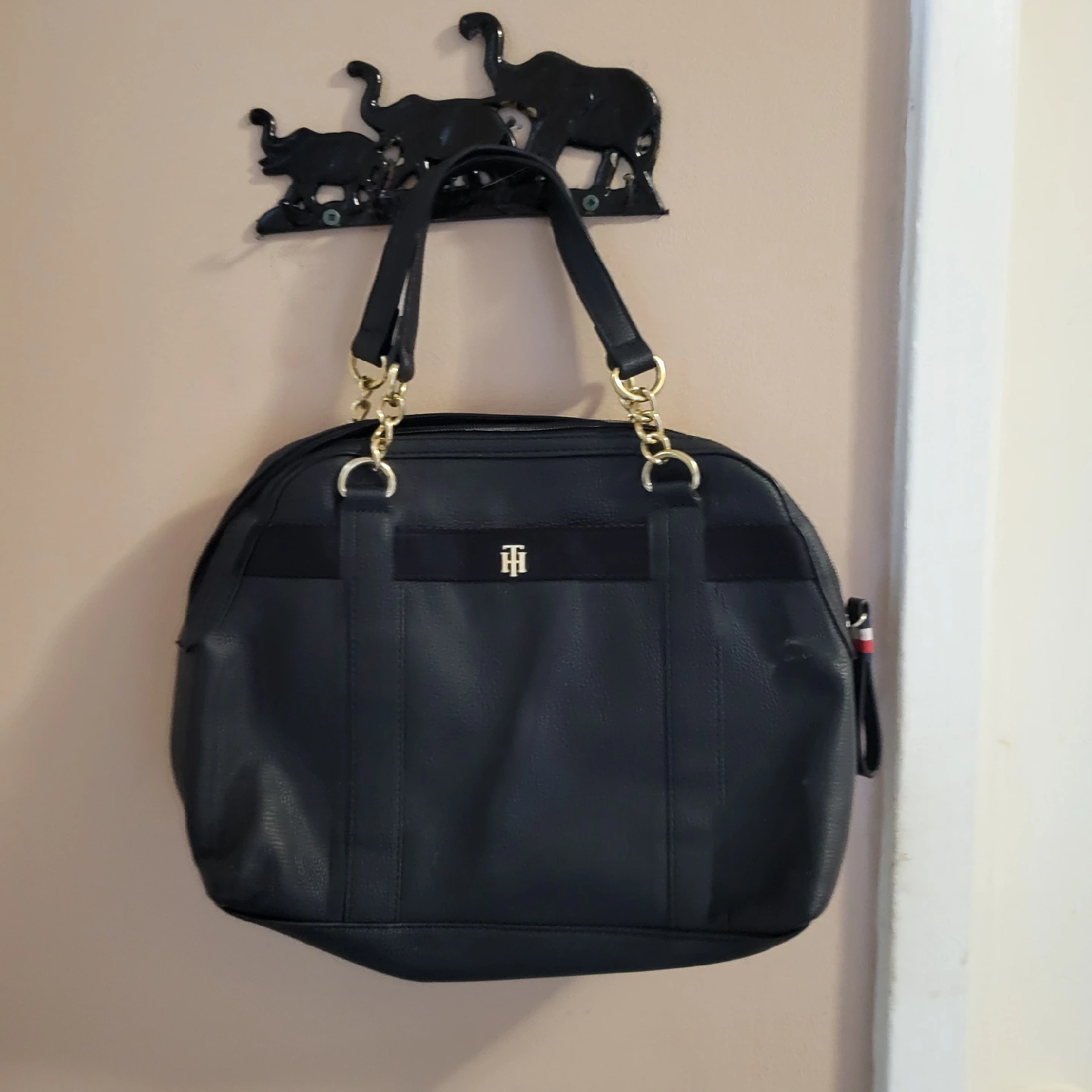 Tommy Hilfiger satchel bag in like new condition and features a black leather exterior with gold chain detailing. The interior is spacious with a zippered pocket and additional compartments.