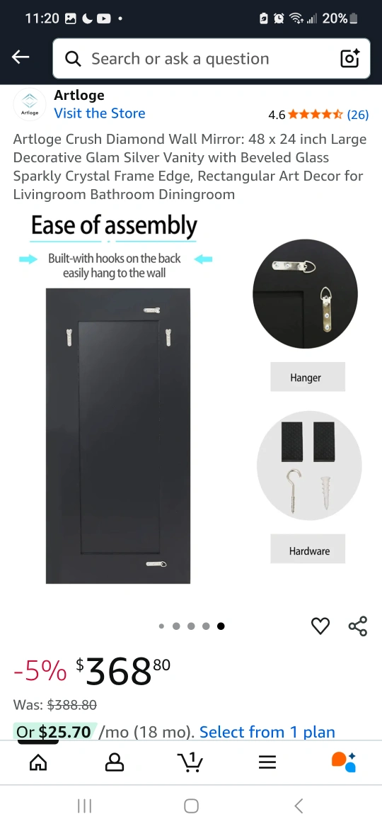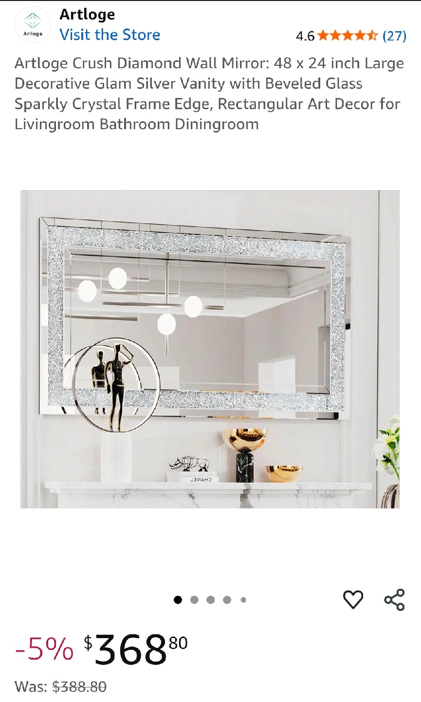 Brand new in box. Price is already way before purchase price therefore it not negotiable. Add a touch of glam to your space with this Artloge Crush Diamond Wall Mirror! It's a large decorative mirror with a sparkly crystal frame and beveled glass. The size is 48 x 24 inches, perfect for a living room, bathroom, or dining room. Originally bought for $368.80 not including tax.