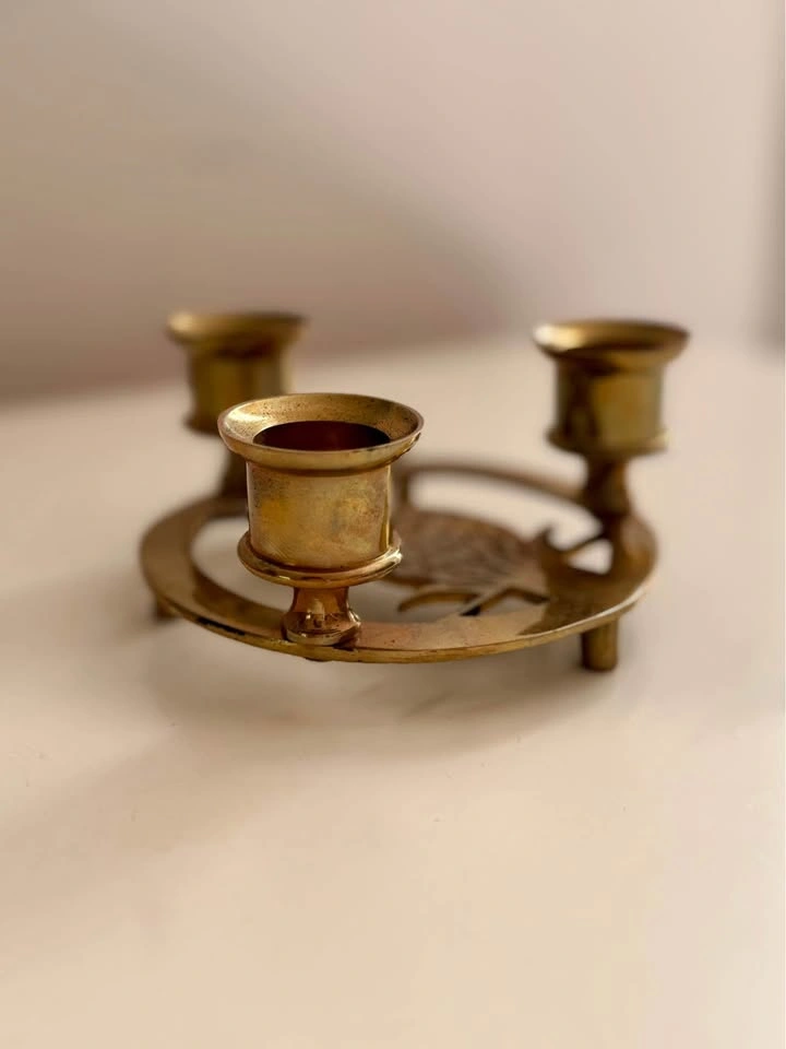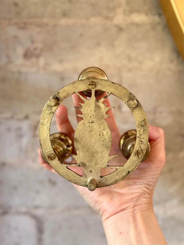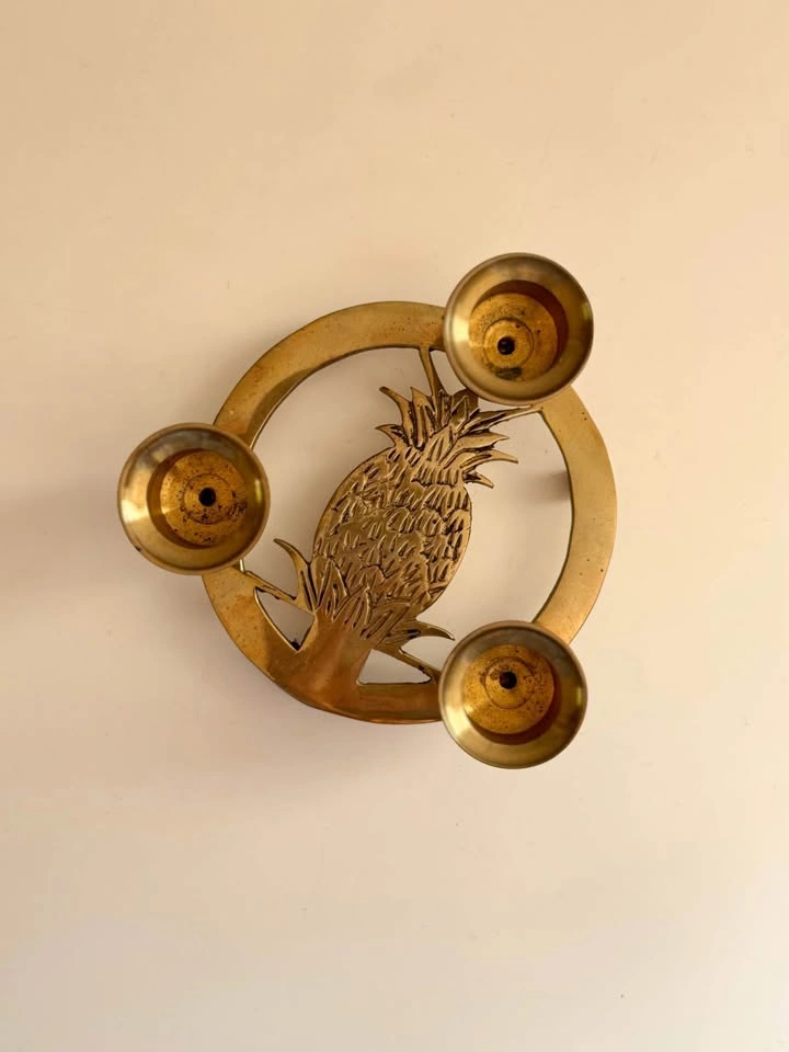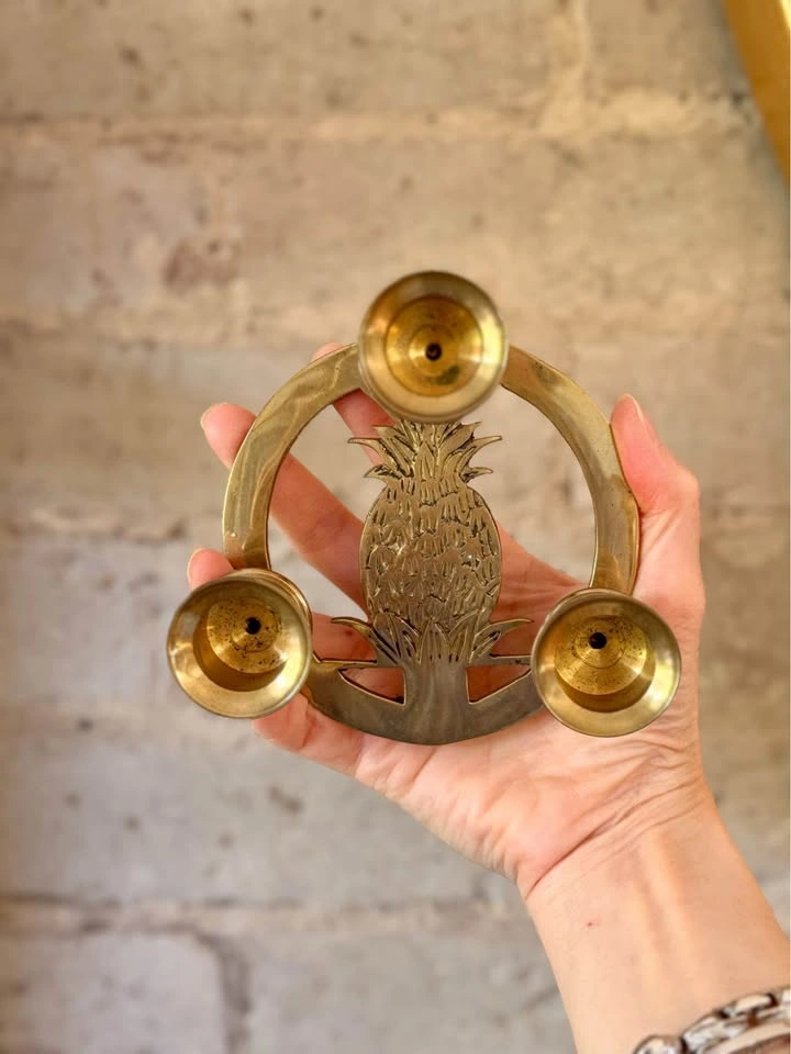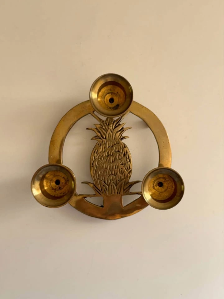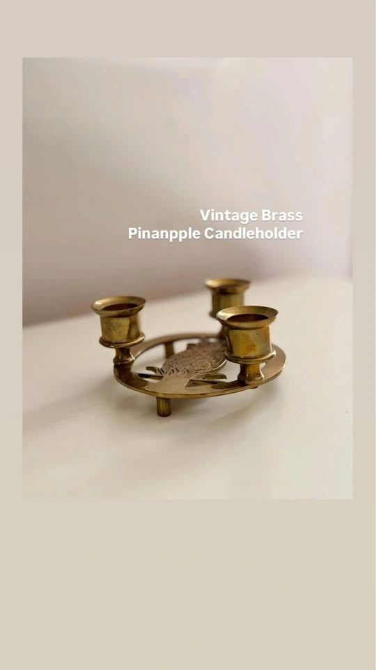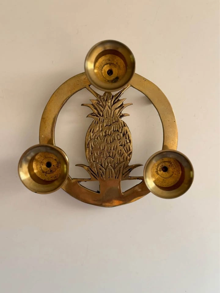 Hard to find very cute Vintage Brass Three Candleholders with Fun Pineapple Motif. Holds 3 candlesticks. Good Vintage condition. You can polish it to a shiner finish but I like the patina. Wear consistent with age. Porch pick up Christie St and St. Clair West Ave. If ad is up, it’s available. Cash only.